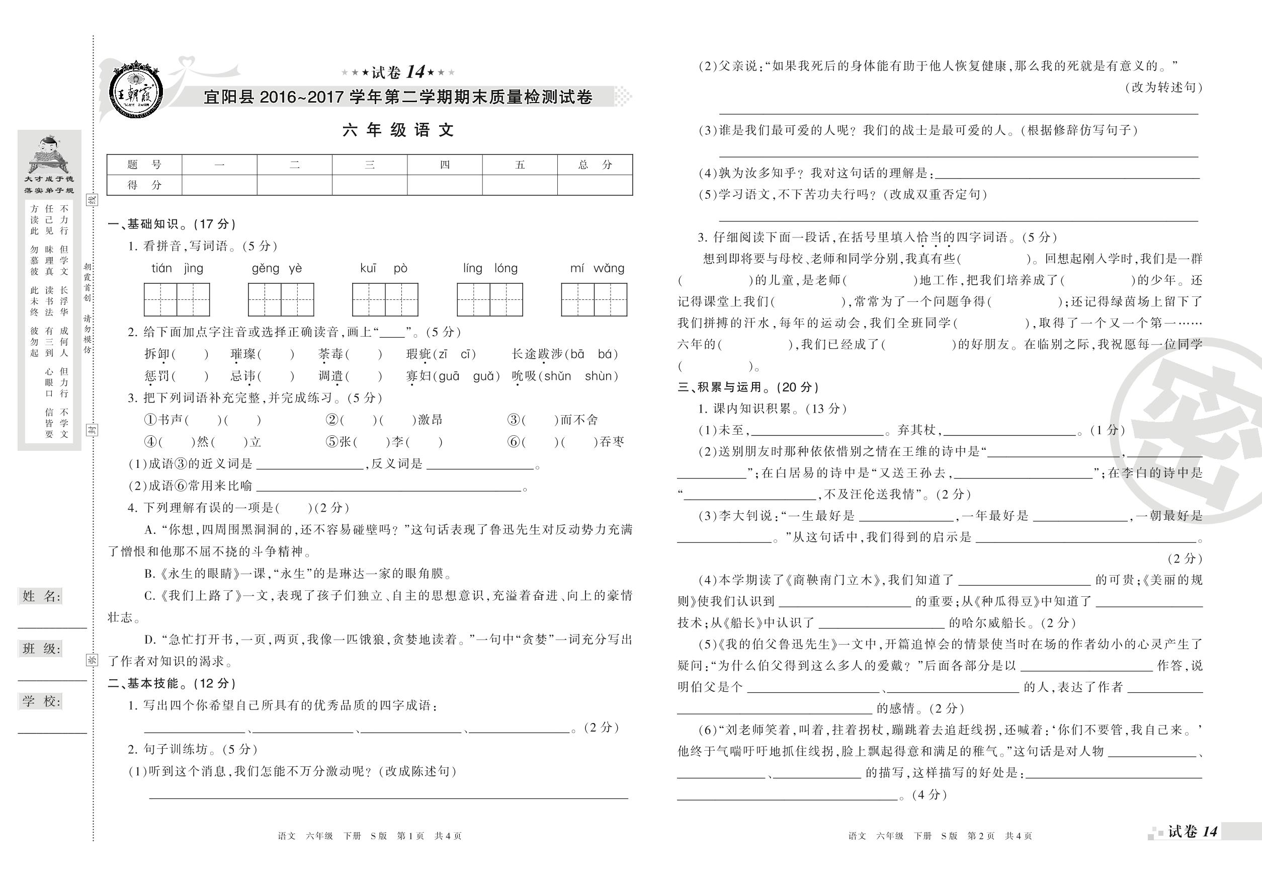 2016-2017学年第二学期洛阳市宜阳县六年级语文试卷(S版)【14】