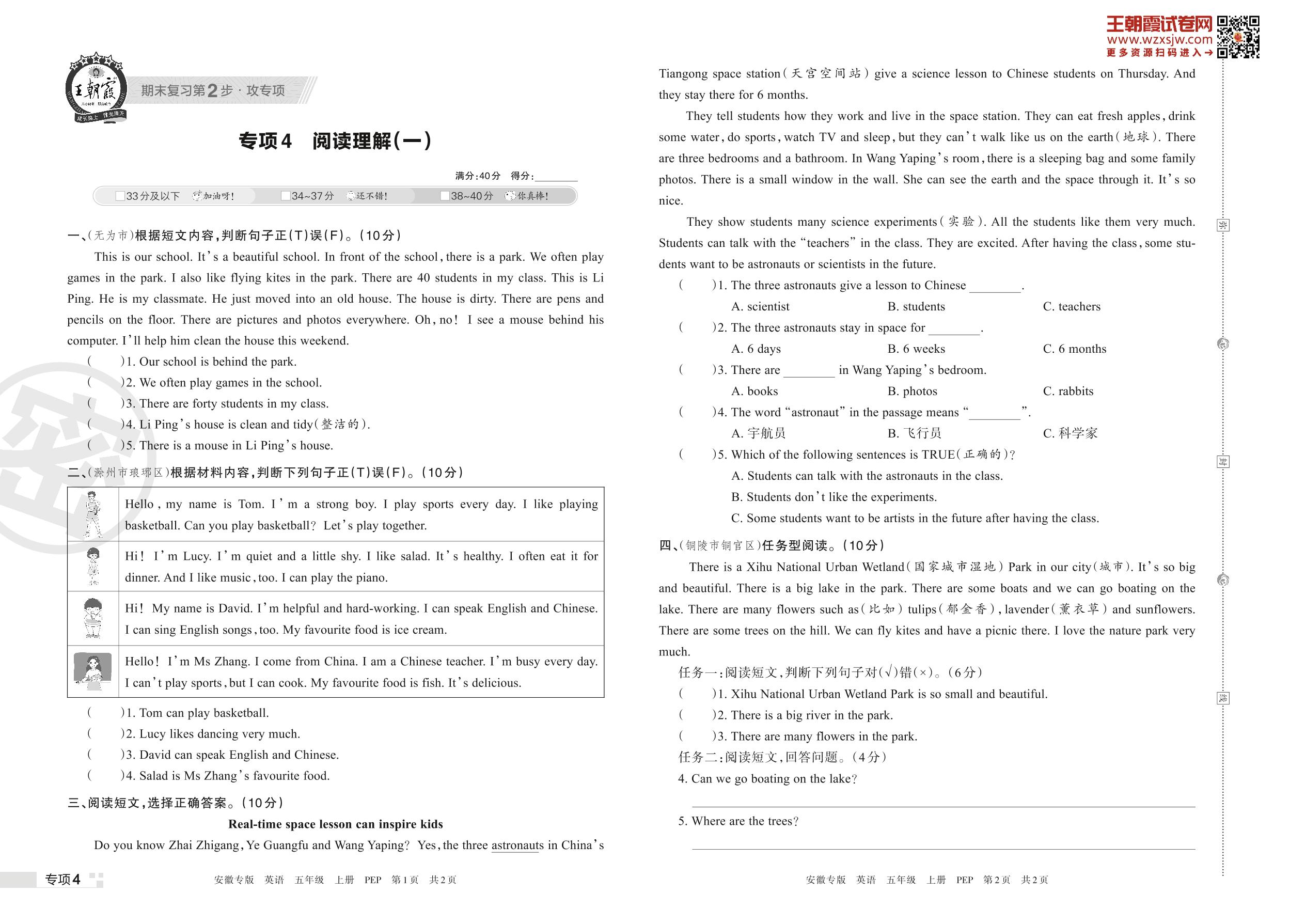 王朝霞期末专项卷——阅读理解(一)五年级上册英语(PEP版)_R221126135328908【4】