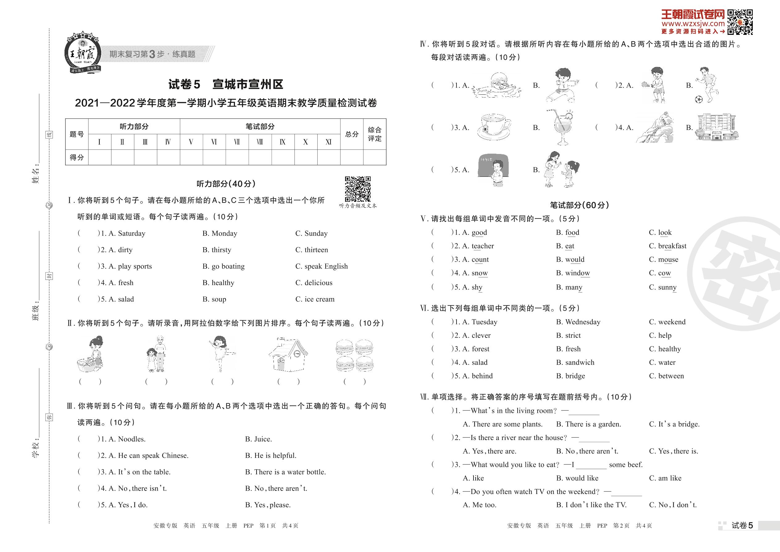 宣城市宣州区2021—2022学年度第一学期小学五年级英语期末教学质量检测试卷(PEP版)【5】