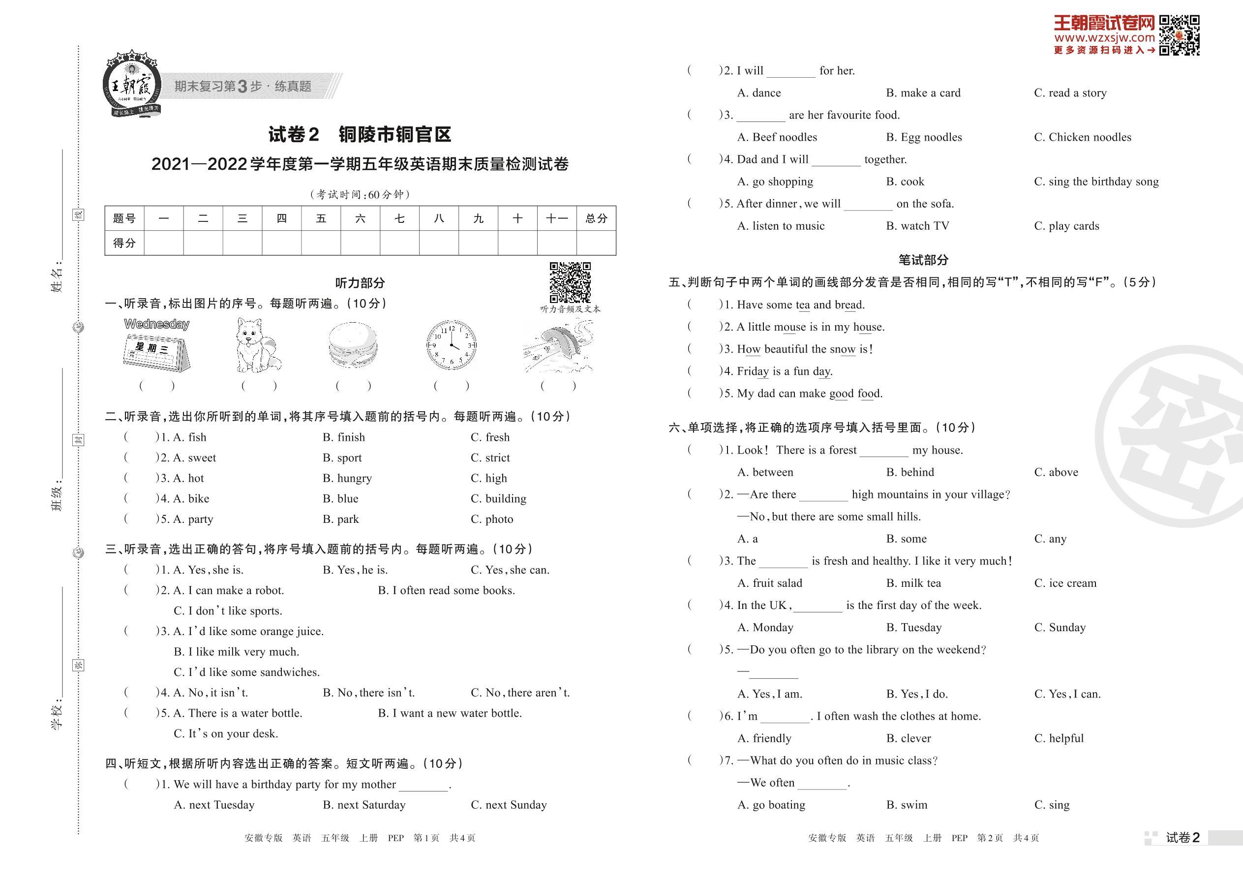 铜陵市铜官区2021—2022学年度第一学期五年级英语期末质量检测试卷(PEP版)【2】