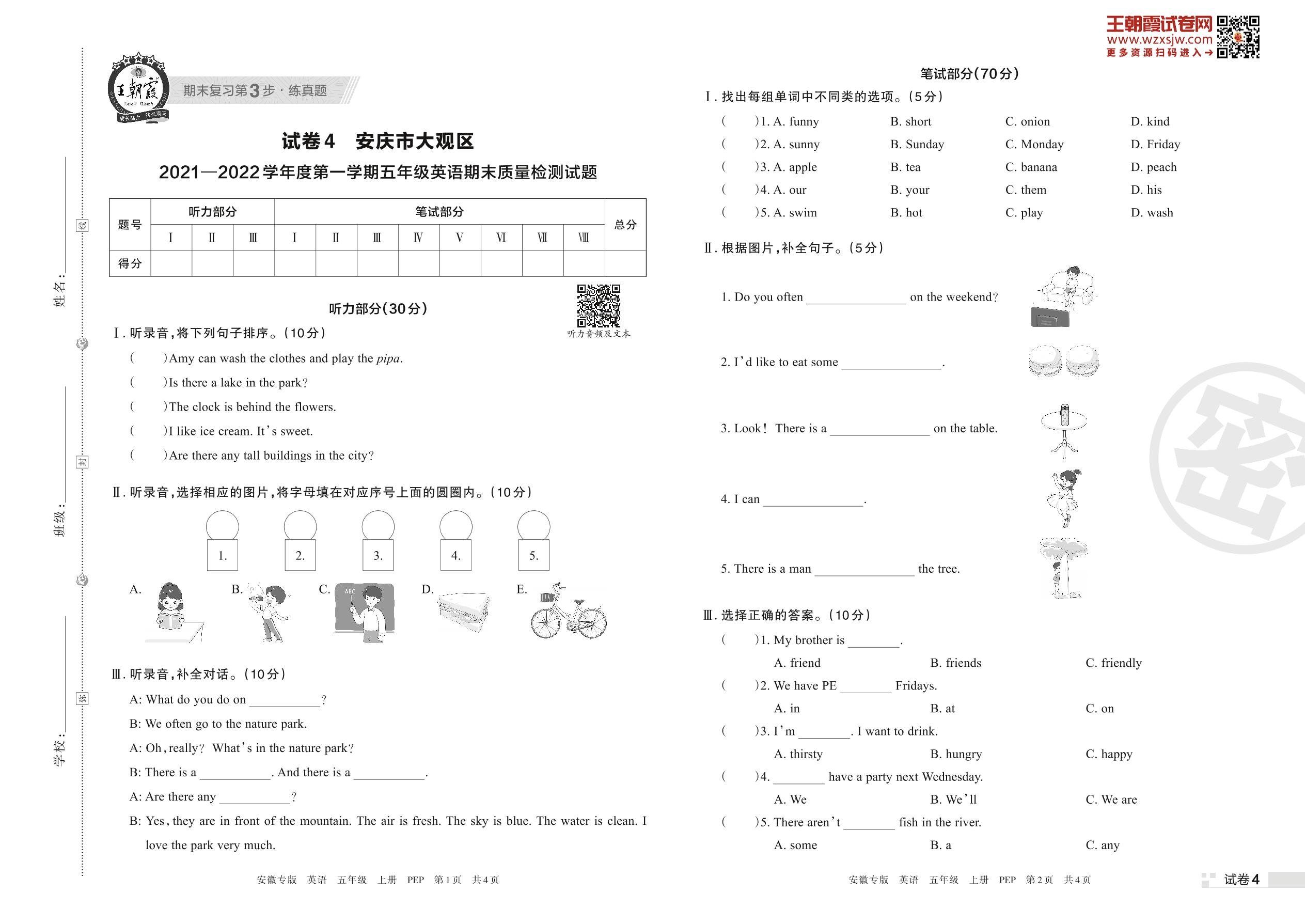 安庆市大观区2021—2022学年度第一学期五年级英语期末质量检测试题(PEP版)【4】