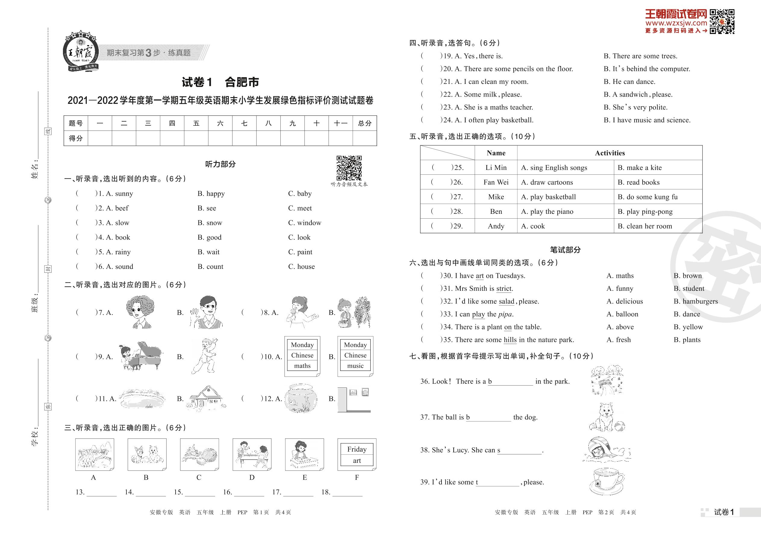 合肥市2021—2022学年度第一学期五年级英语期末小学生发展绿色指标评价测试试题卷(PEP版)【1】
