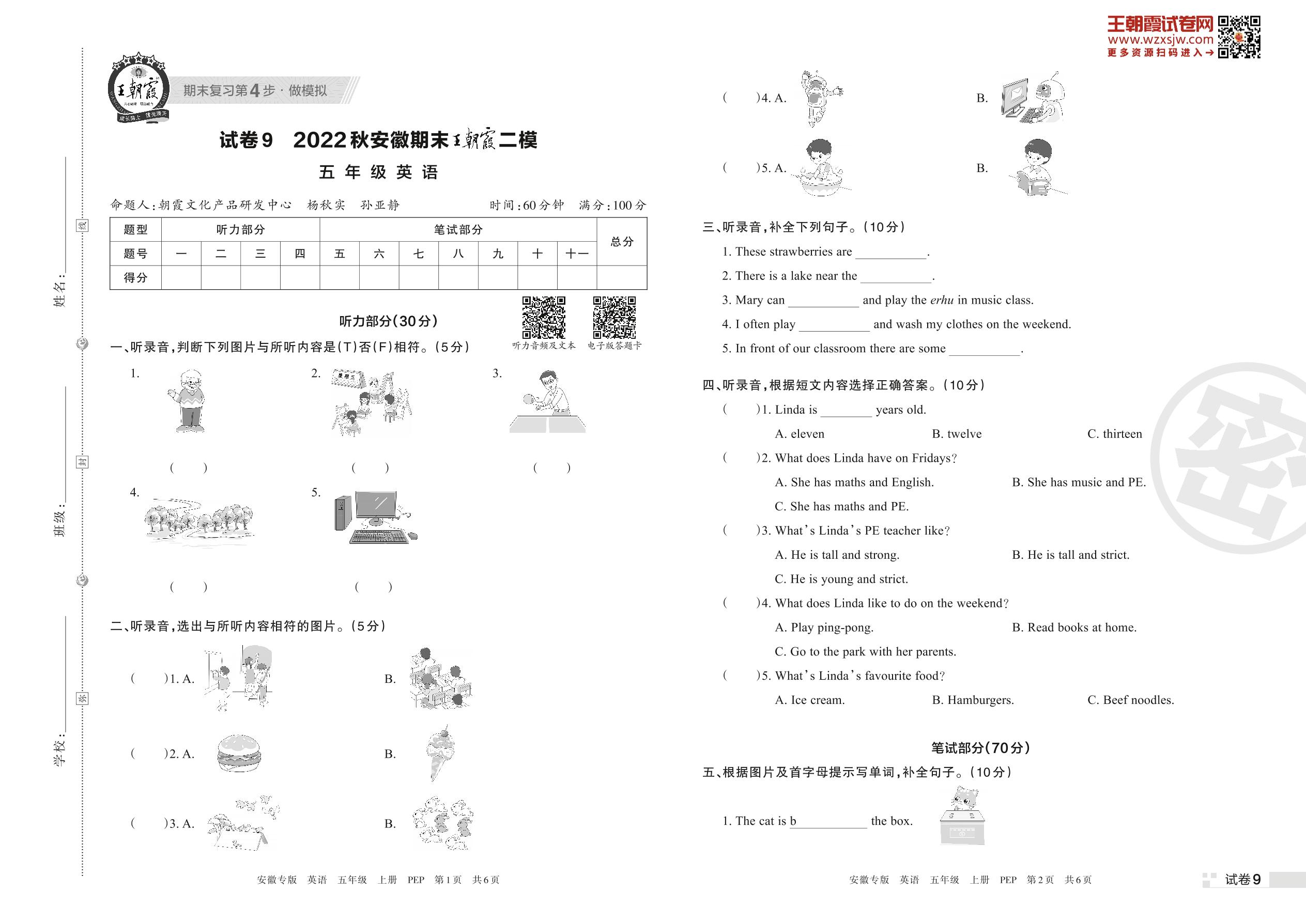 王朝霞期末模拟卷五年级上册英语(PEP版)_R221126135329693【9】
