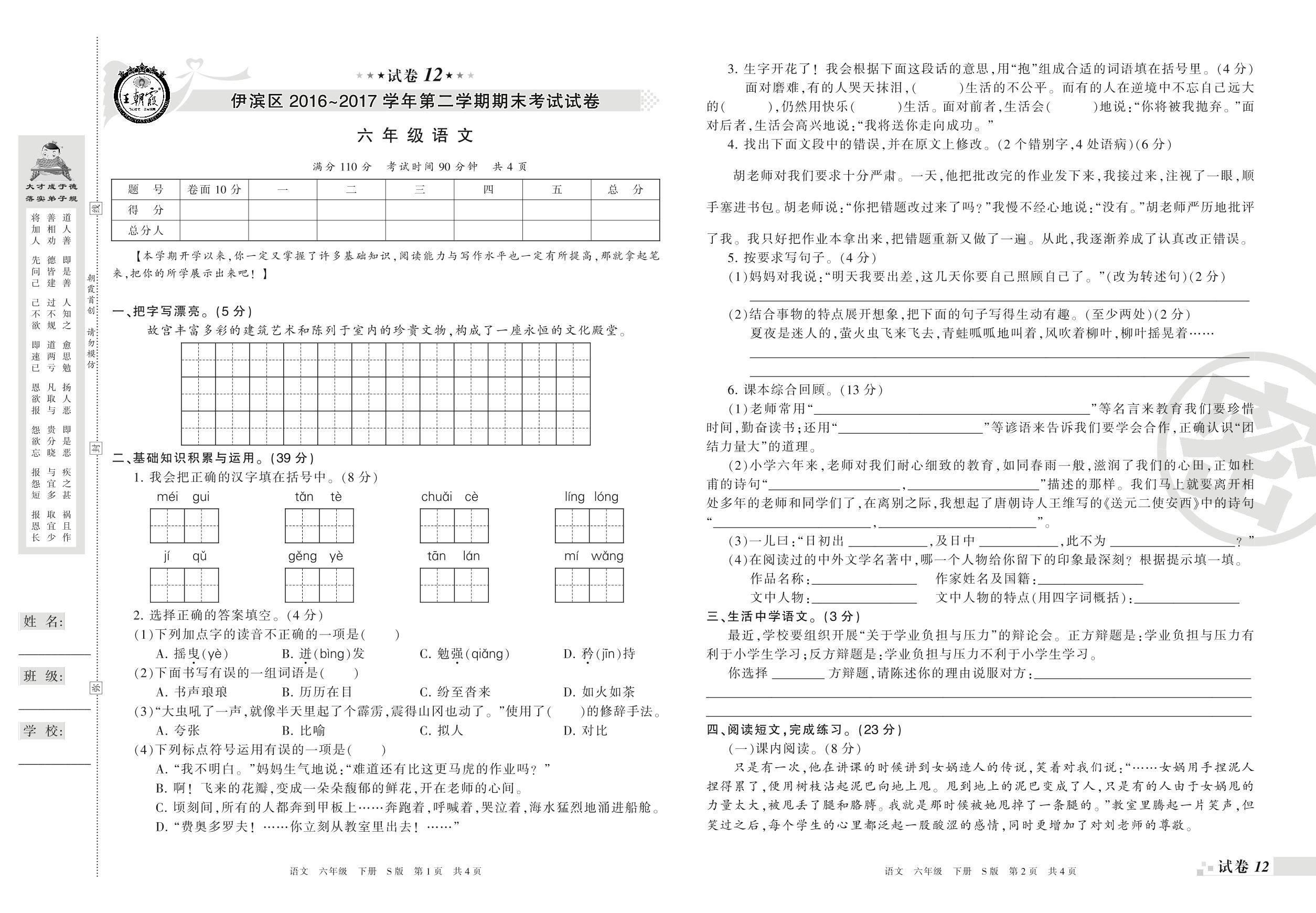 2016-2017学年第二学期洛阳市伊滨区六年级语文试卷(S版)【12】