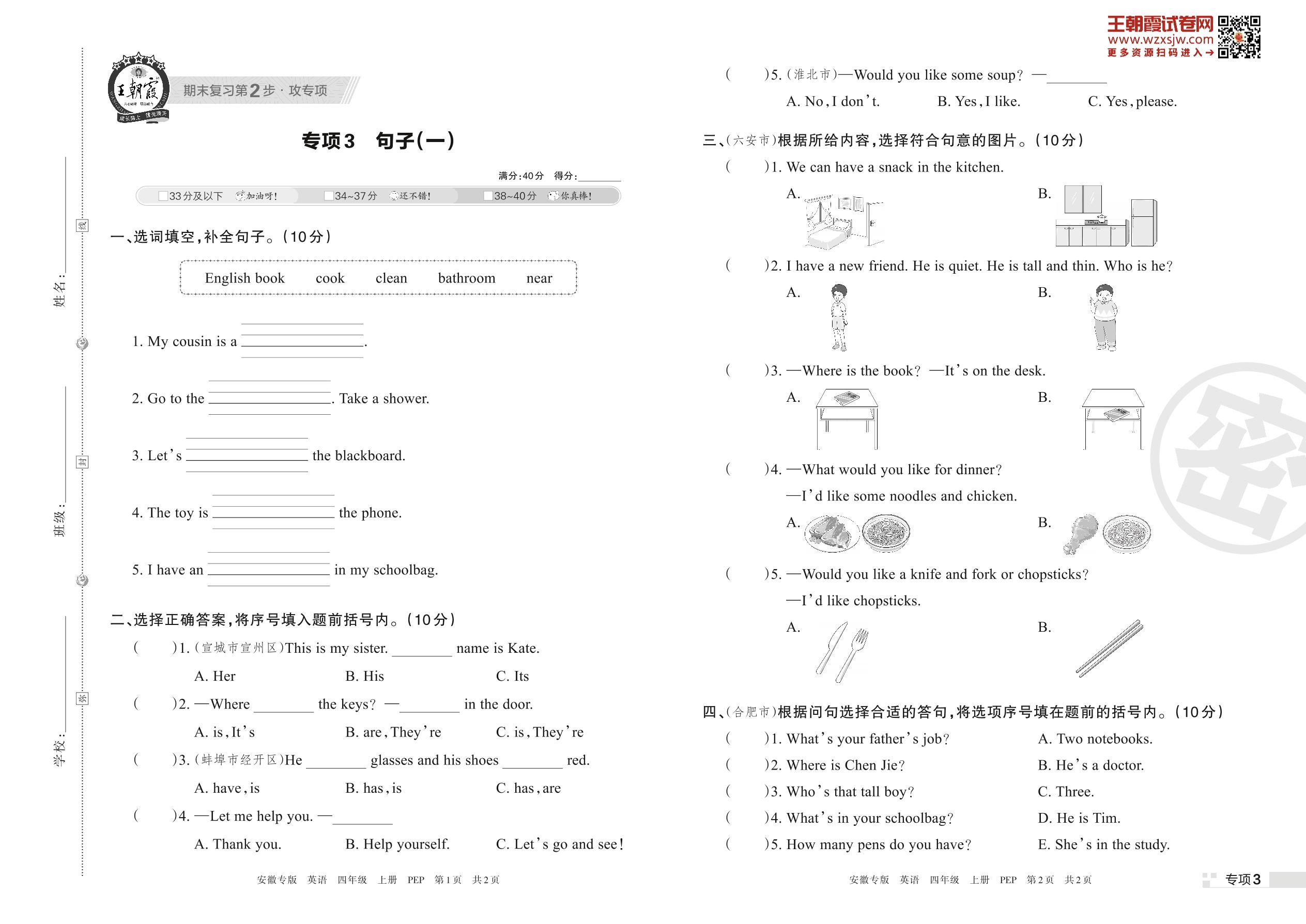 王朝霞期末专项卷——句子(一)四年级上册英语(PEP版)【3】