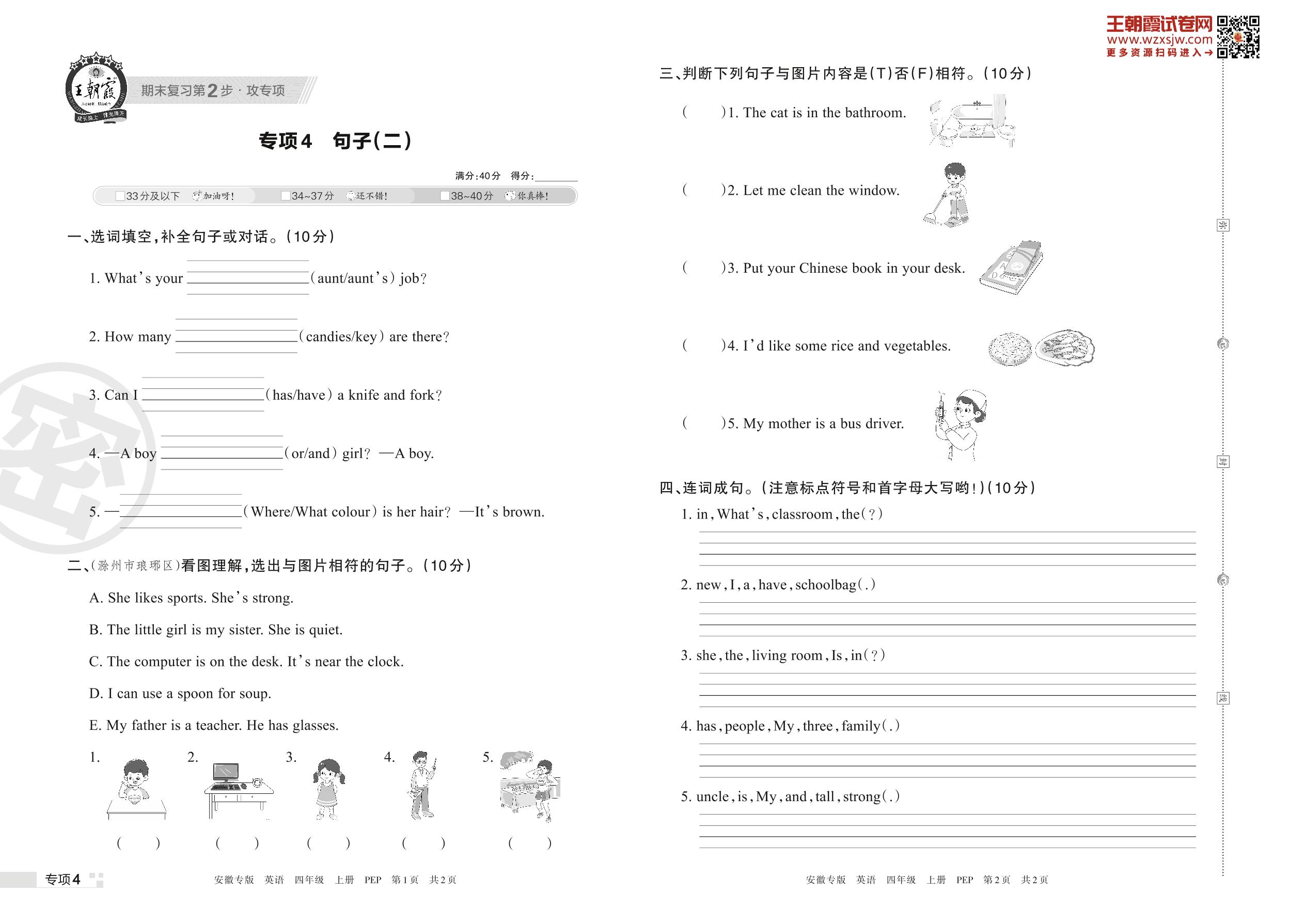 王朝霞期末专项卷——句子(二)四年级上册英语(PEP版)【4】