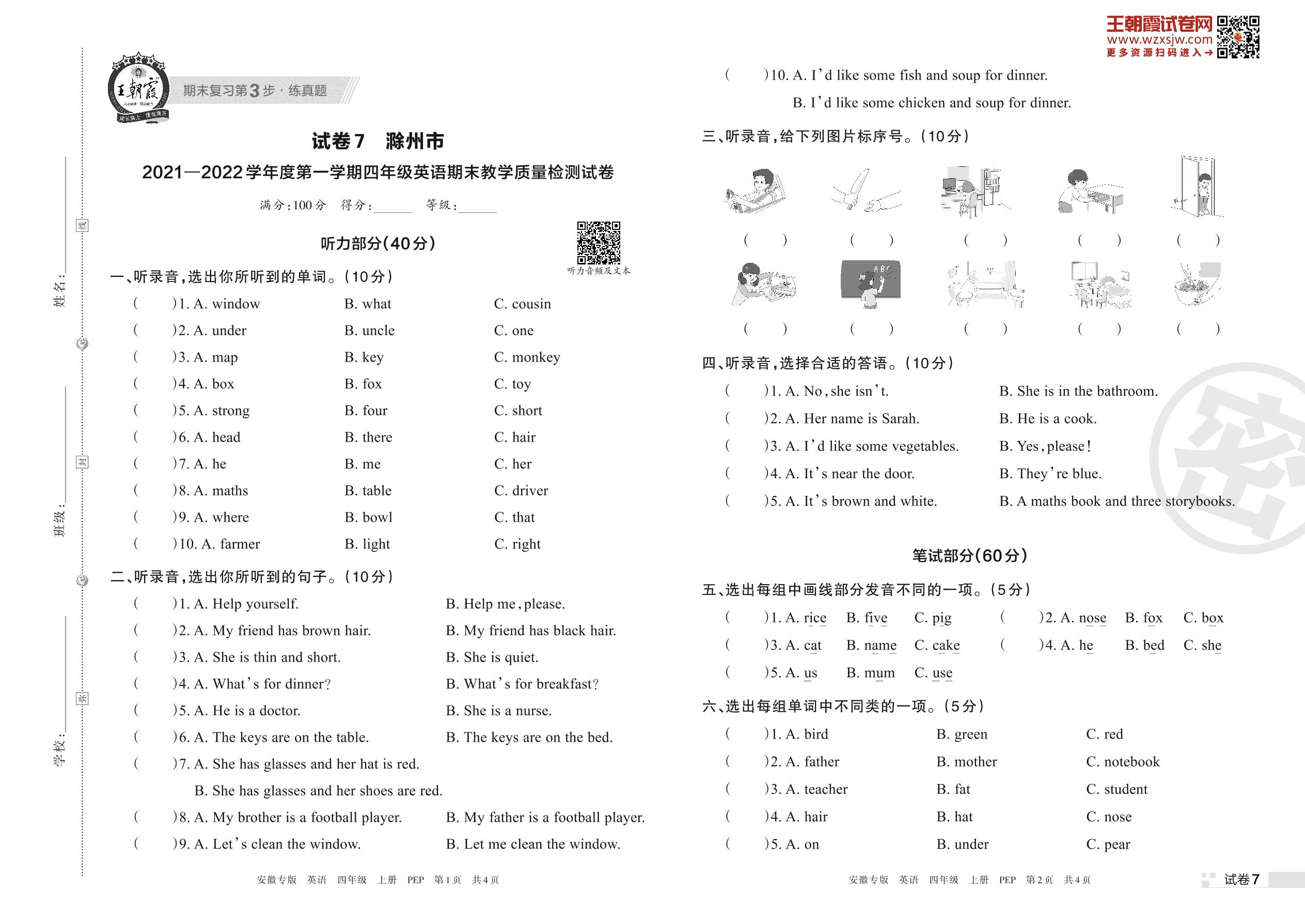 滁州市2021—2022学年度第一学期四年级英语期末教学质量检测试卷(PEP版)【7】