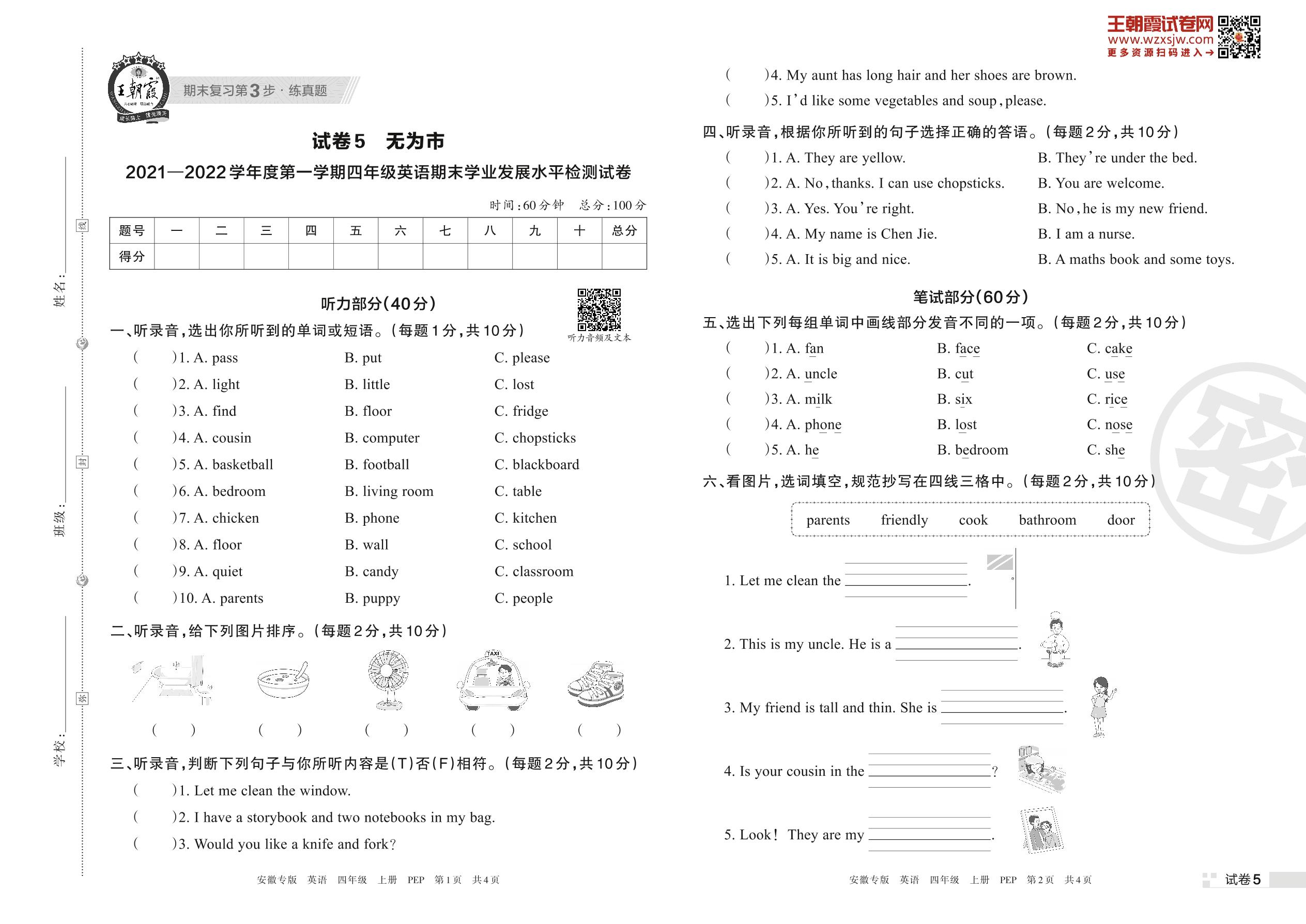 无为市2021—2022学年度第一学期四年级英语期末学业发展水平检测试卷 (PEP版)【5】