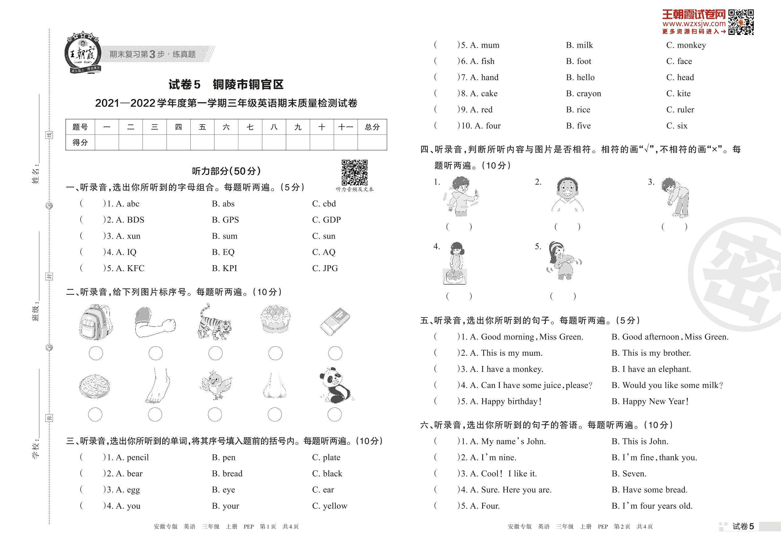 铜陵市铜官区2021—2022学年度第一学期三年级英语期末质量检测试卷(PEP版)【5】
