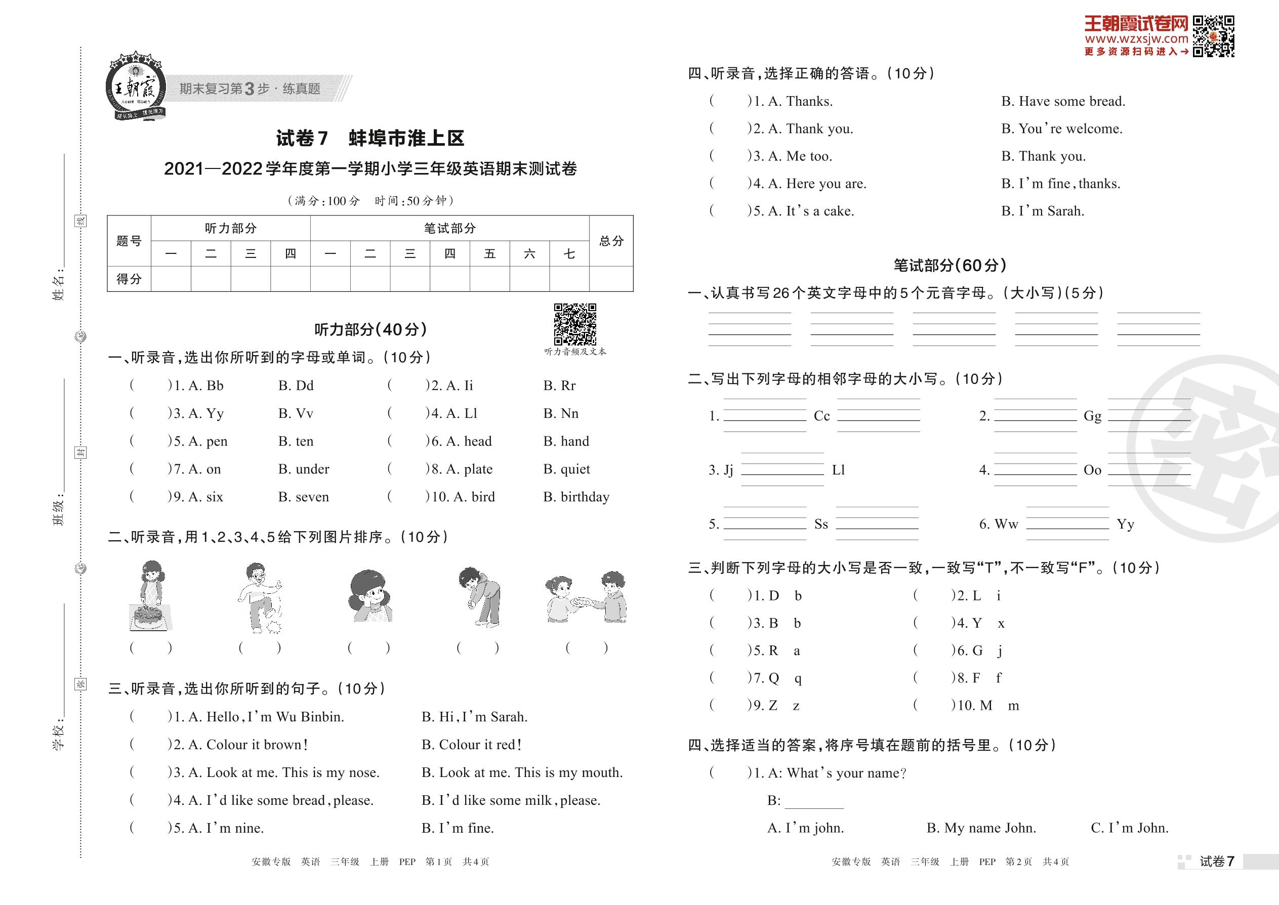 蚌埠市淮上区2021—2022学年度第一学期小学三年级英语期末测试卷(PEP版)【7】