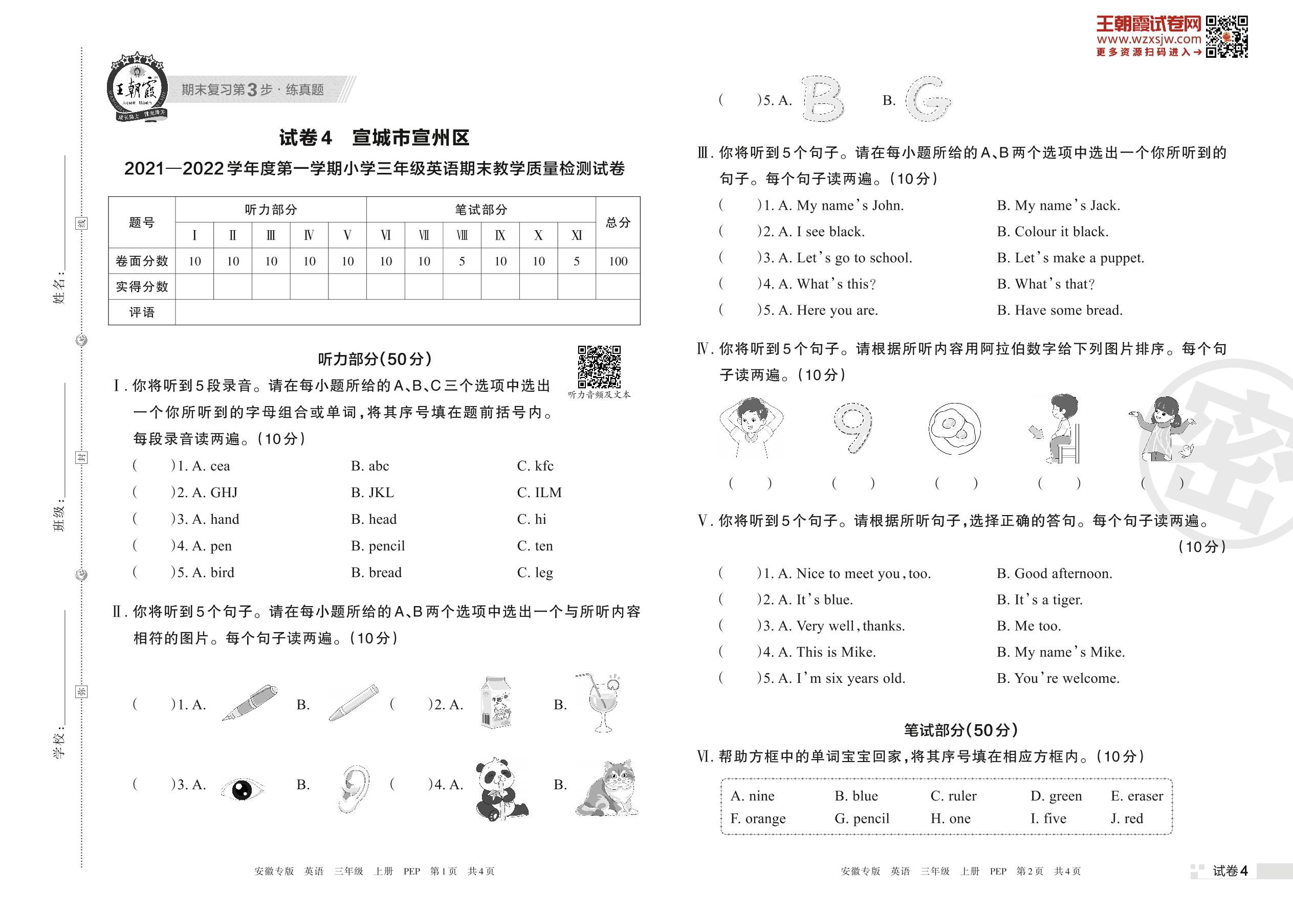 宣城市宣州区2021—2022学年度第一学期小学三年级英语期末教学质量检测试卷(PEP版)【4】