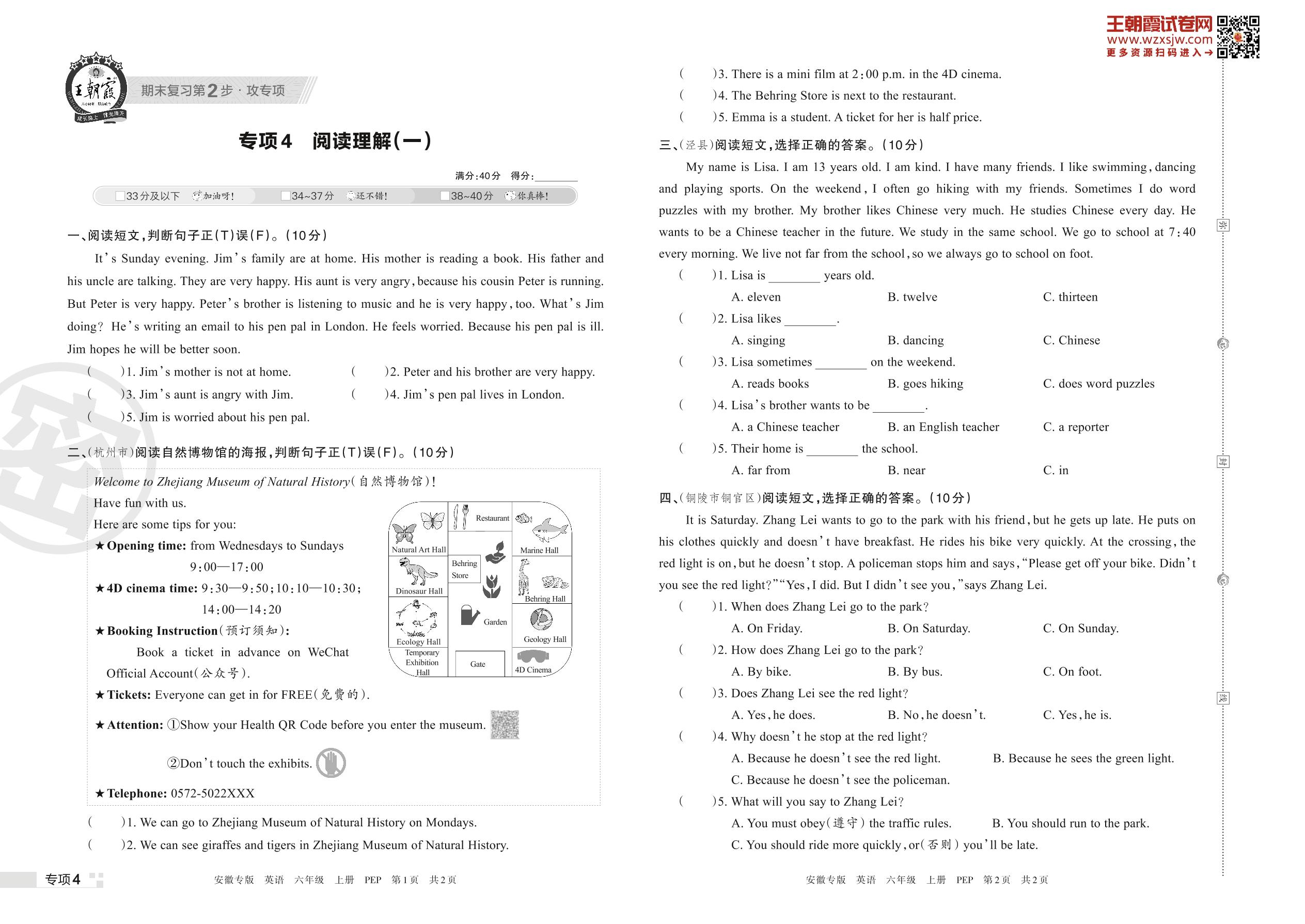 王朝霞期末专项卷——阅读理解(一)六年级上册英语(PEP版)_R221126143024420【4】