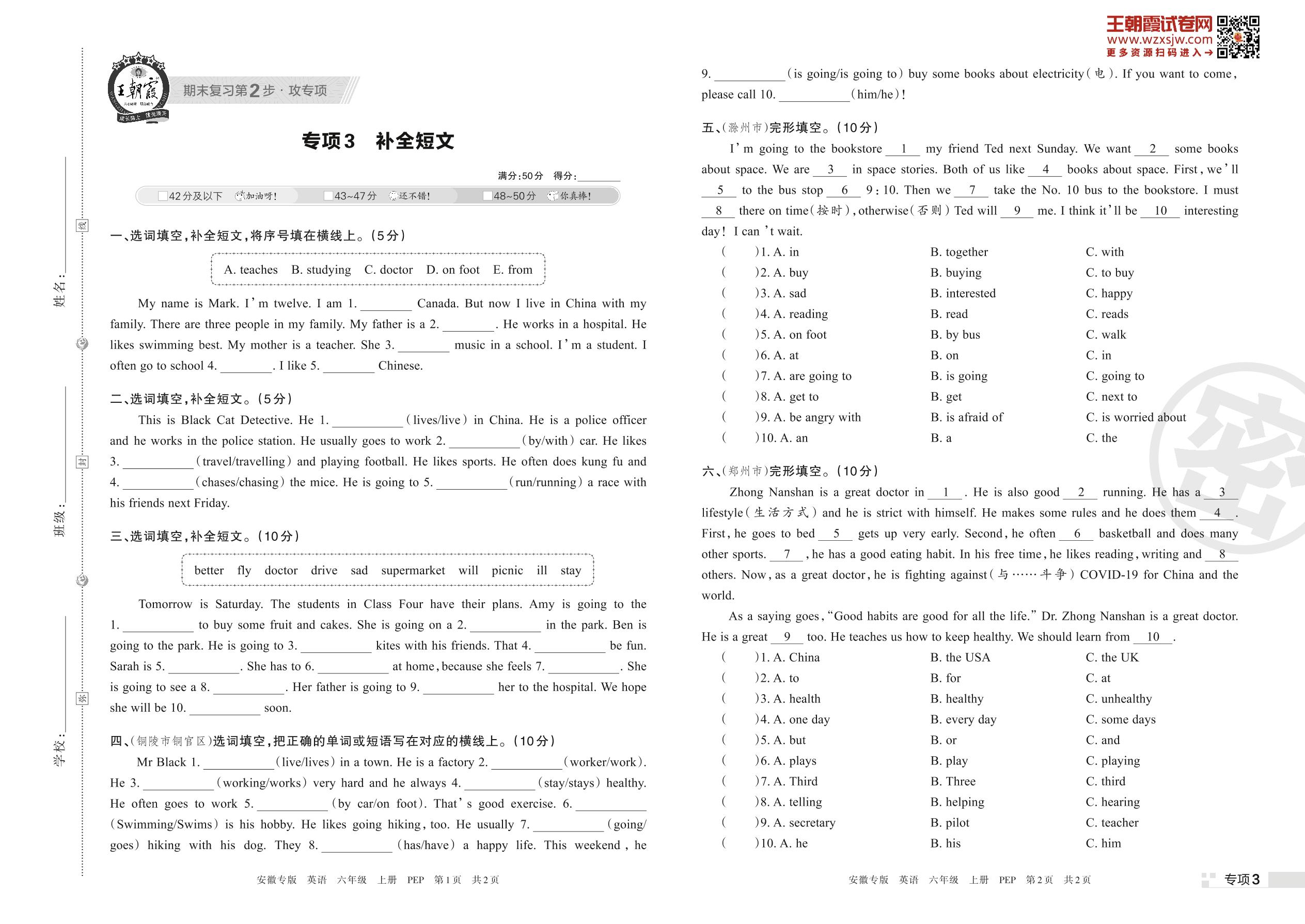 王朝霞期末专项卷——补全短文六年级上册英语(PEP版)_R221126143025301【3】