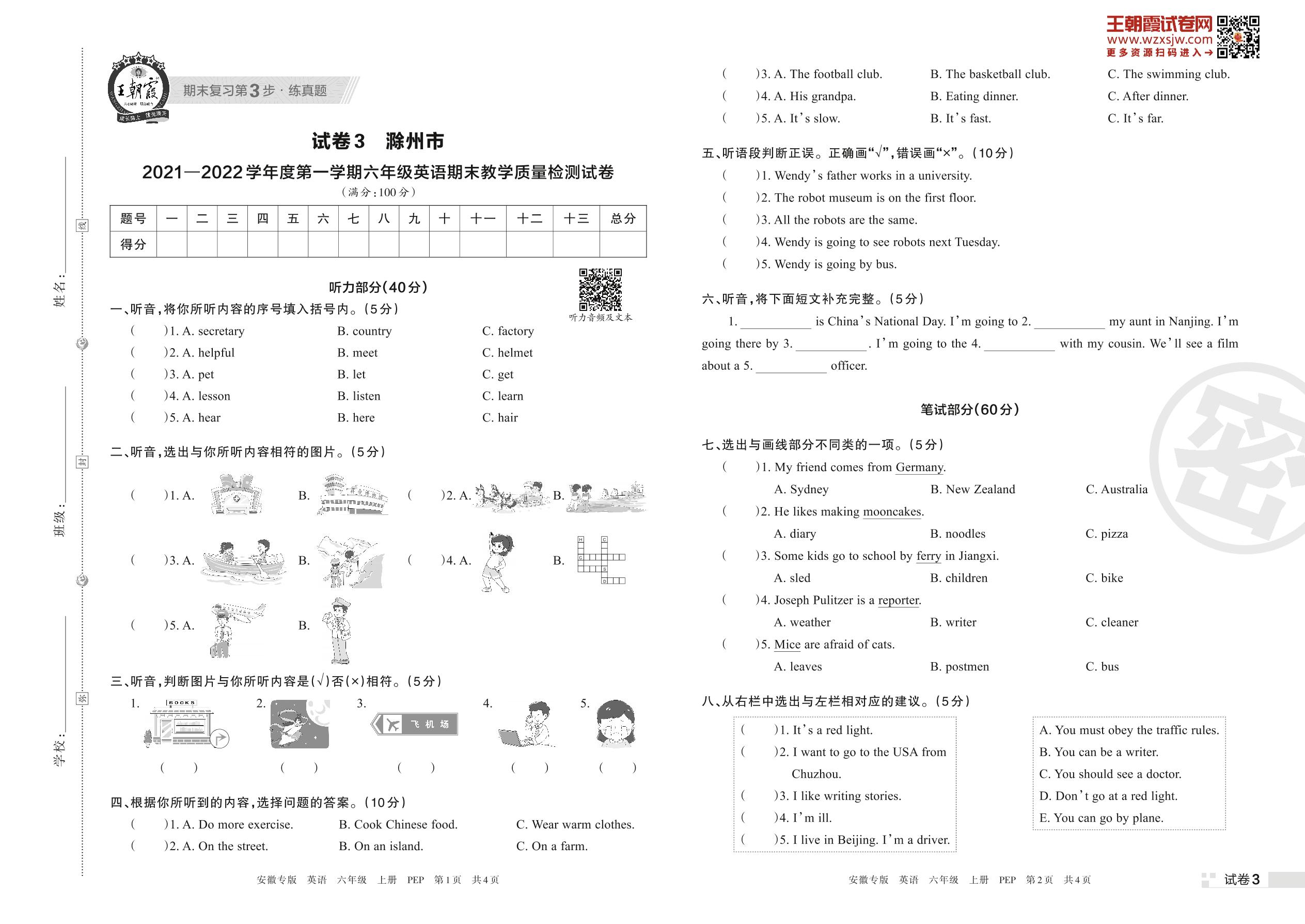 滁州市2021—2022学年度第一学期六年级英语期末教学质量检测试卷(PEP版)【3】