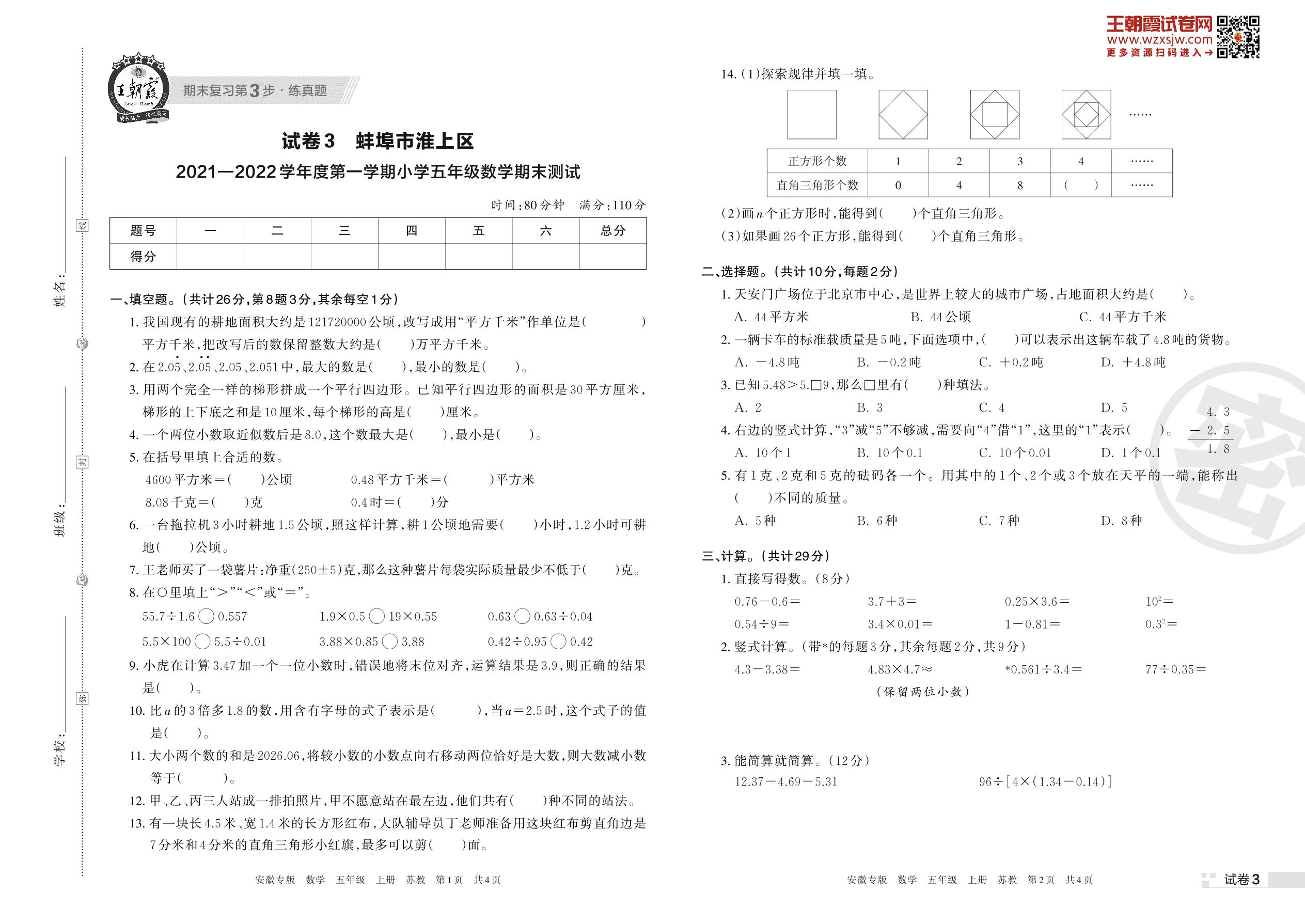 蚌埠市淮上区2021—2022学年度第一学期小学五年级数学期末测试(人教版)【3】