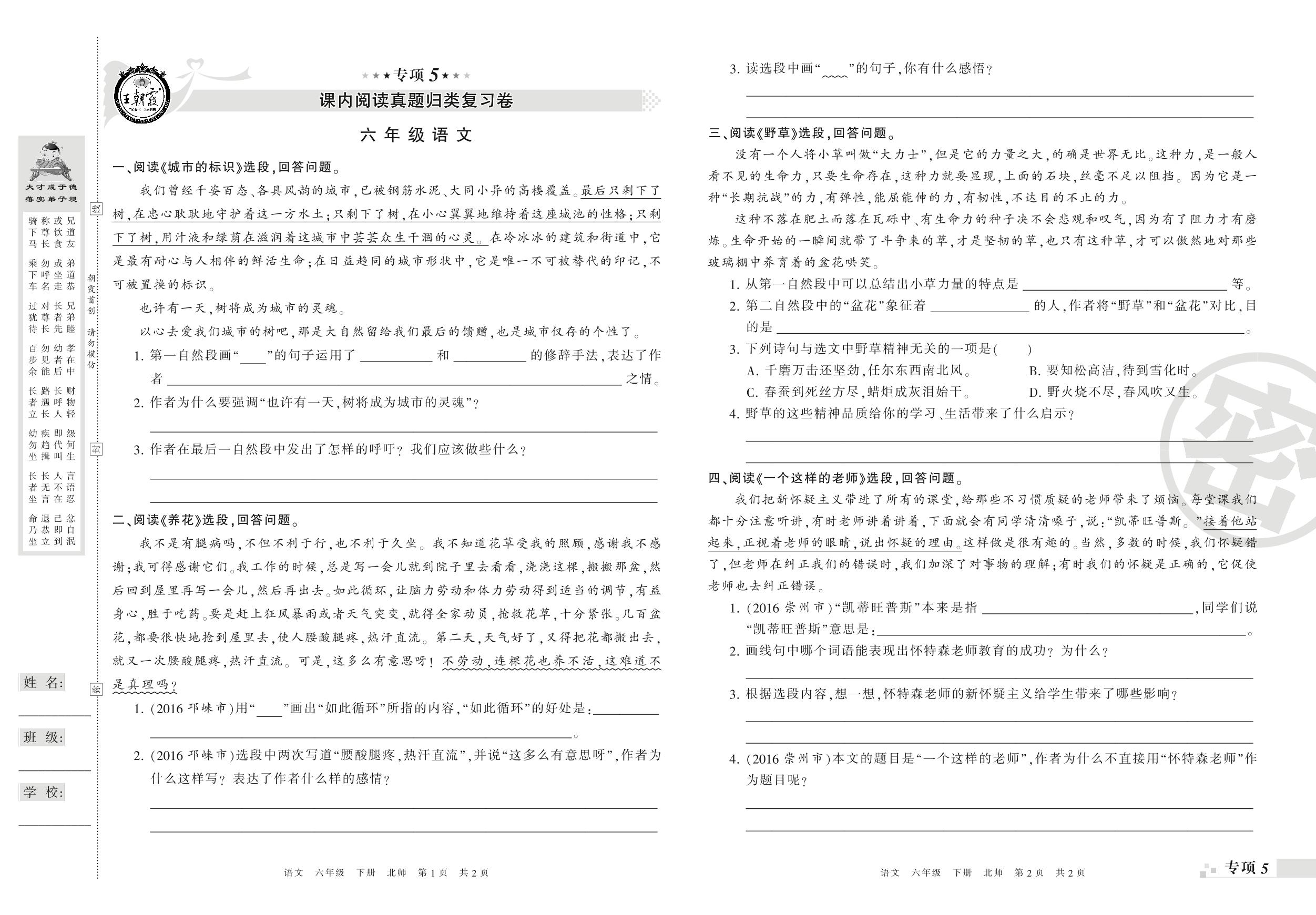 王朝霞期末专项卷——课内阅读、课外阅读与写作真题归类复习卷六年级下册语文(北师版)_R210802133304【0】
