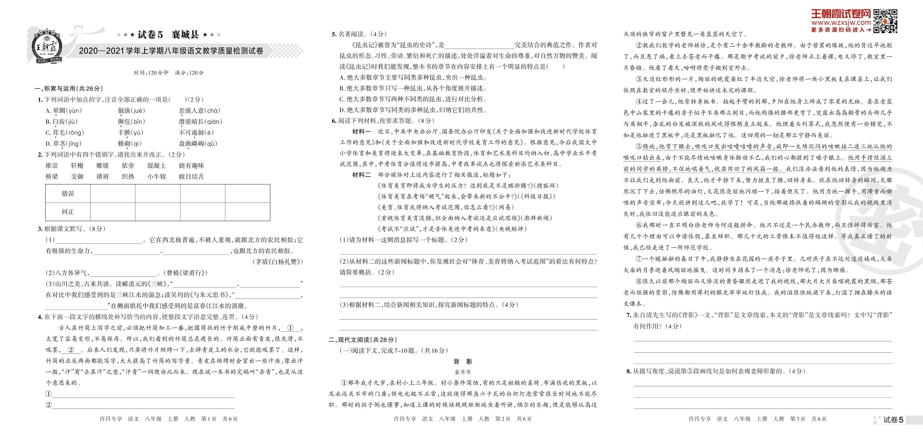 襄城县2020—2021学年上学期八年级语文教学质量检测试卷(人教版)【5】