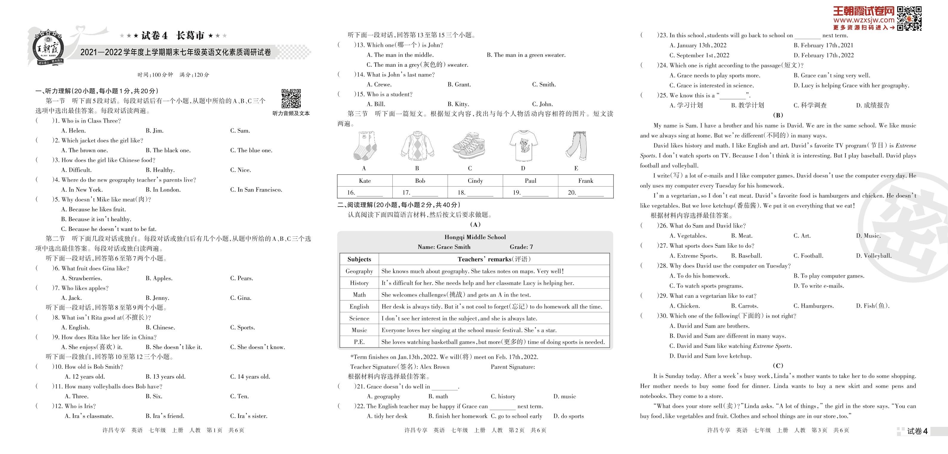长葛市2021—2022学年度上学期期末七年级英语文化素质调研试卷(人教版)【4】