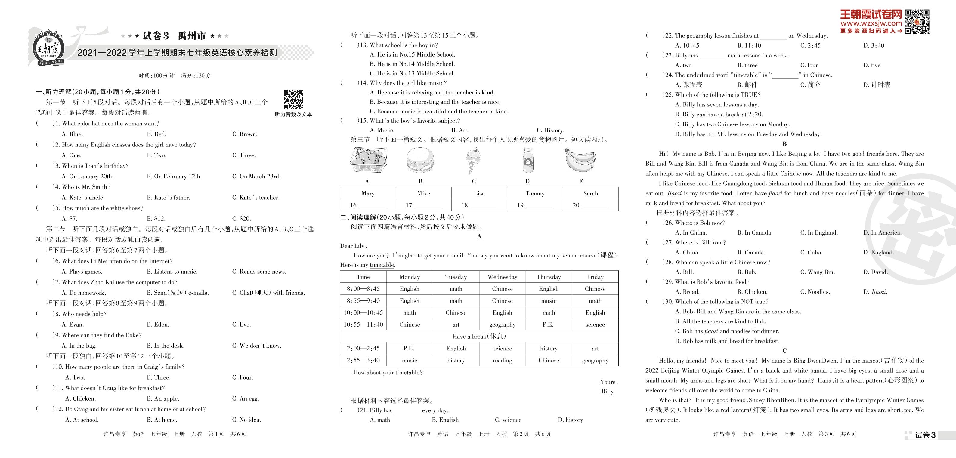 禹州市2021—2022学年上学期期末七年级英语核心素养检测(人教版)【3】