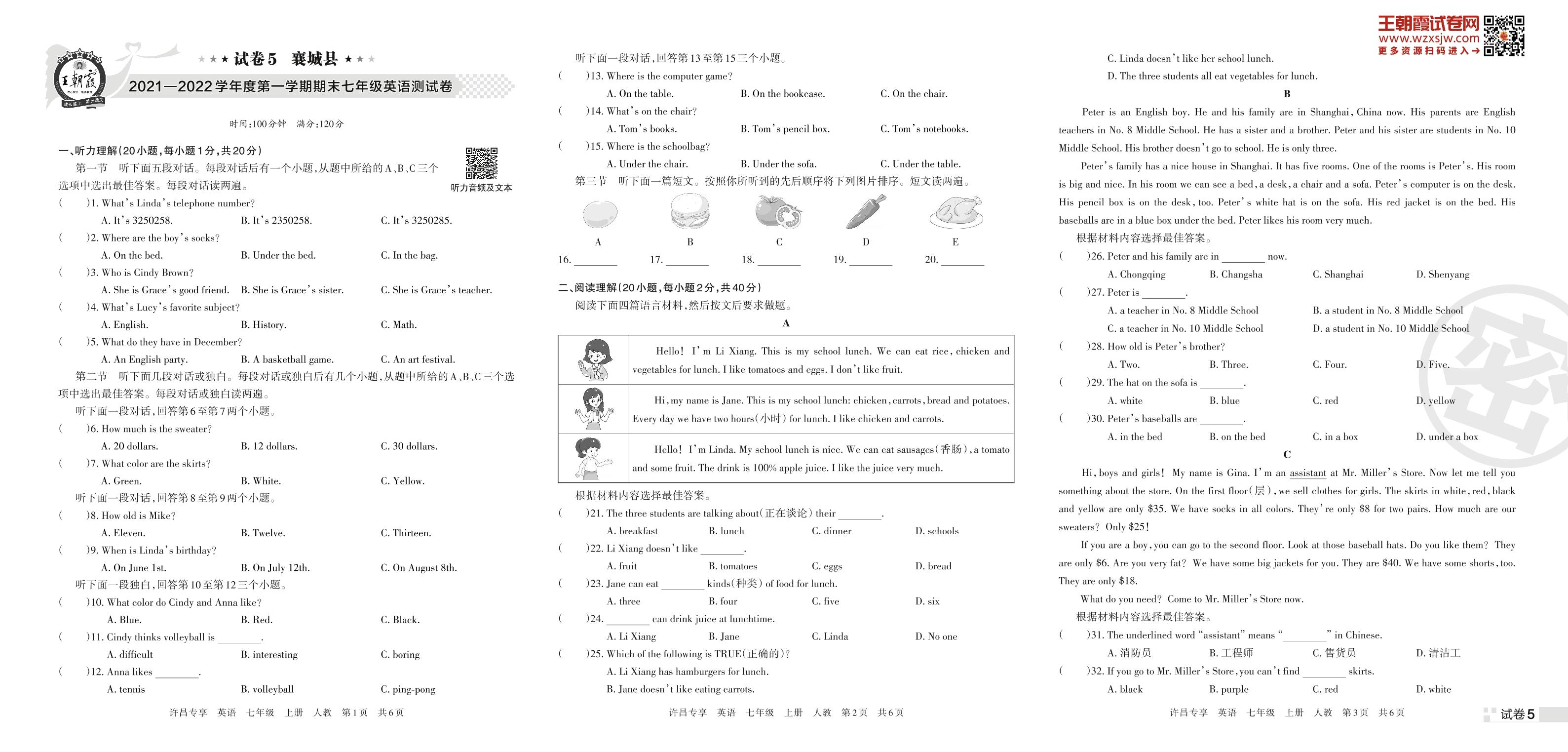 襄城县2021—2022学年度第一学期期末七年级英语测试卷(人教版)【5】