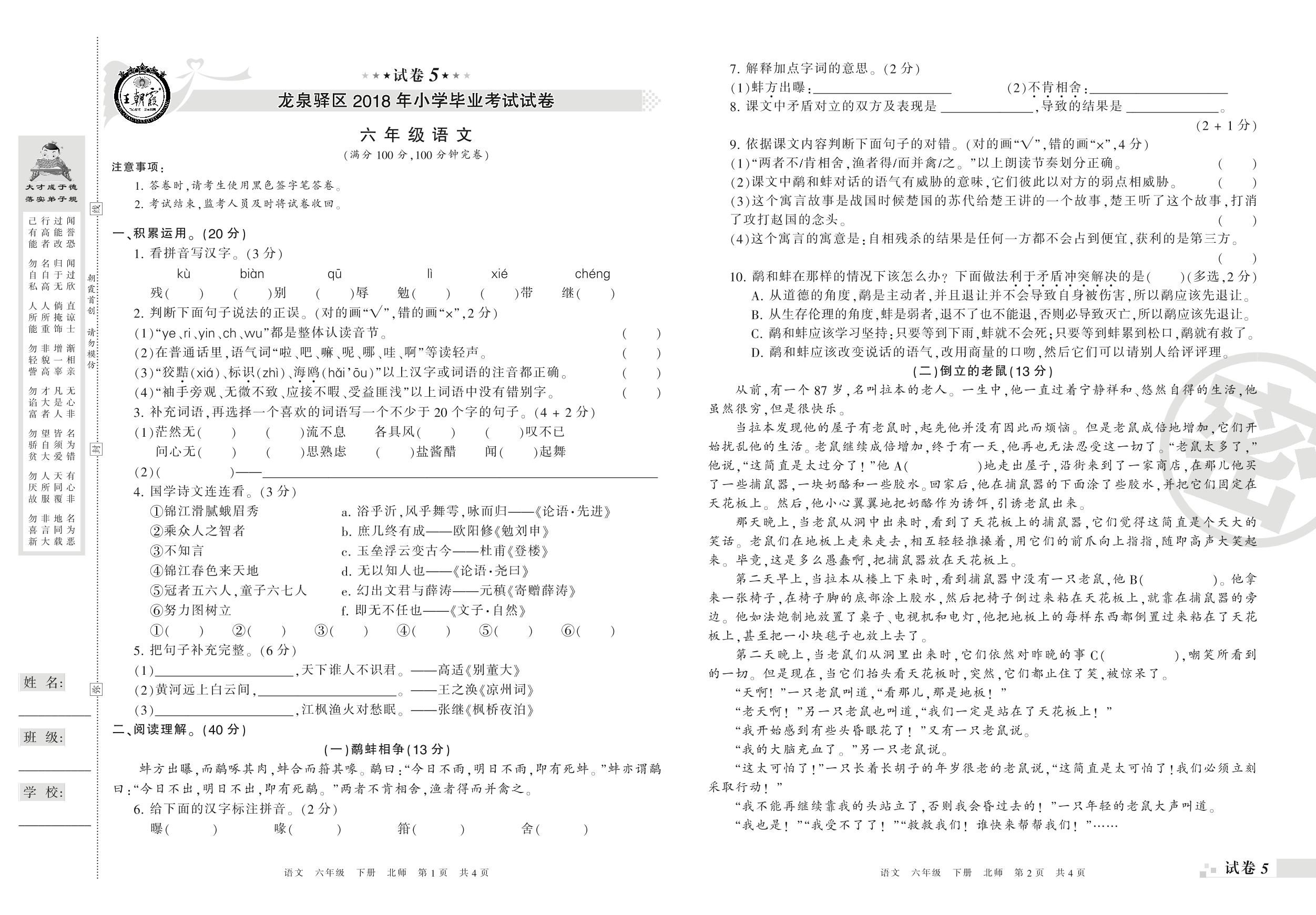 2017-2018学年第二学期成都市龙泉驿区六年级语文试卷(北师版)【5】