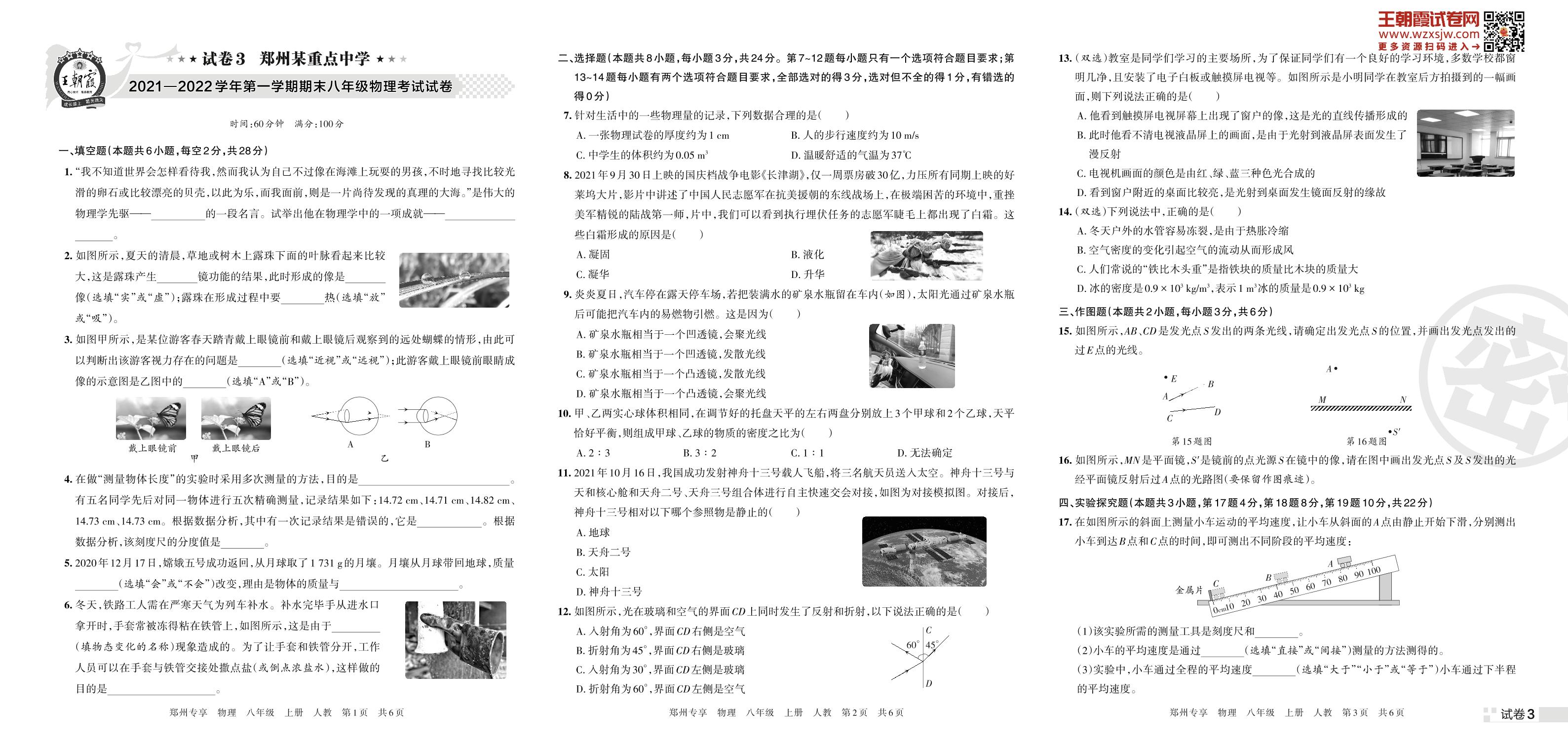 郑州某重点中学2021—2022学年第一学期期末八年级物理考试试卷(人教版)【3】