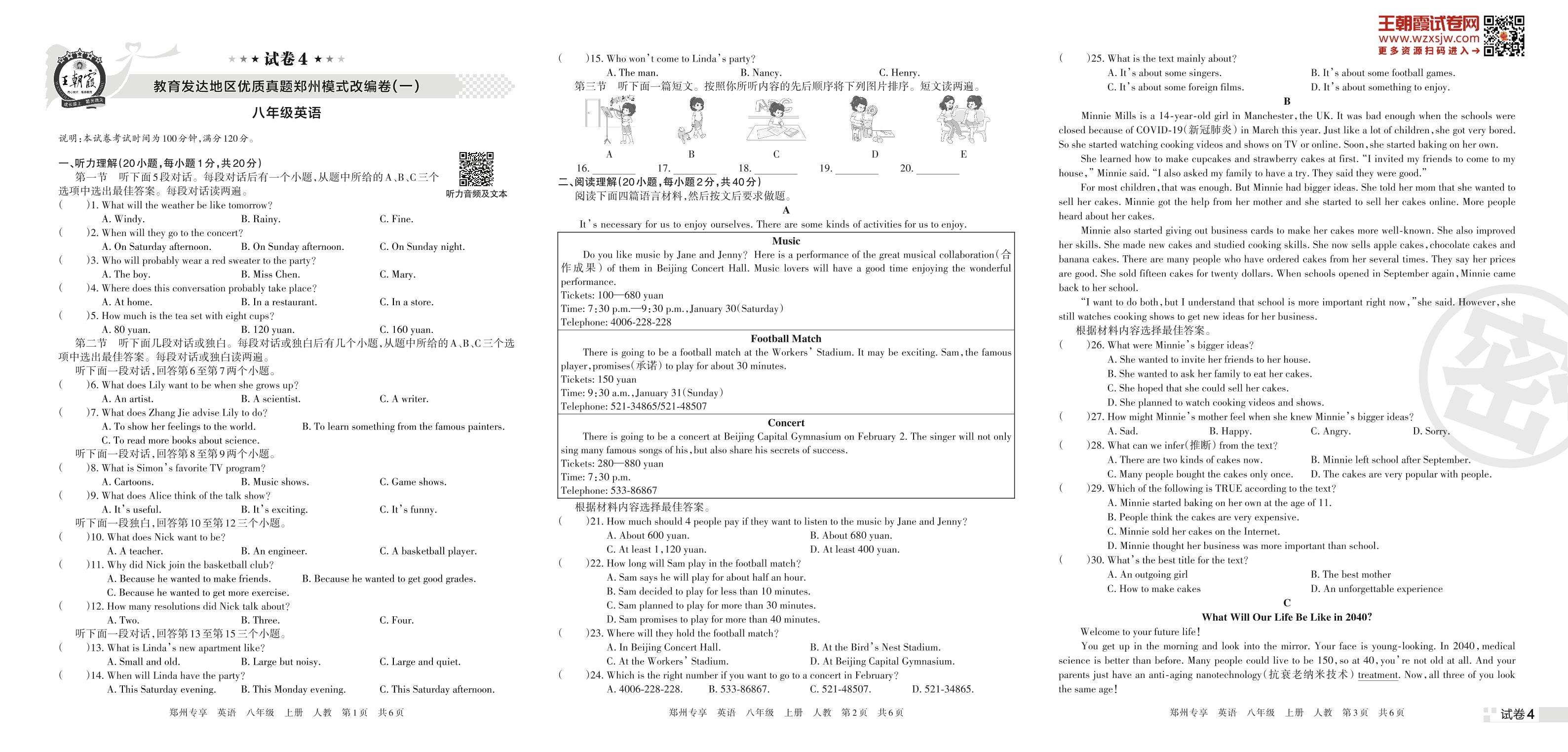 教育发达地区优质真题郑州模式改编卷(一)八年级上册英语(人教版)【4】