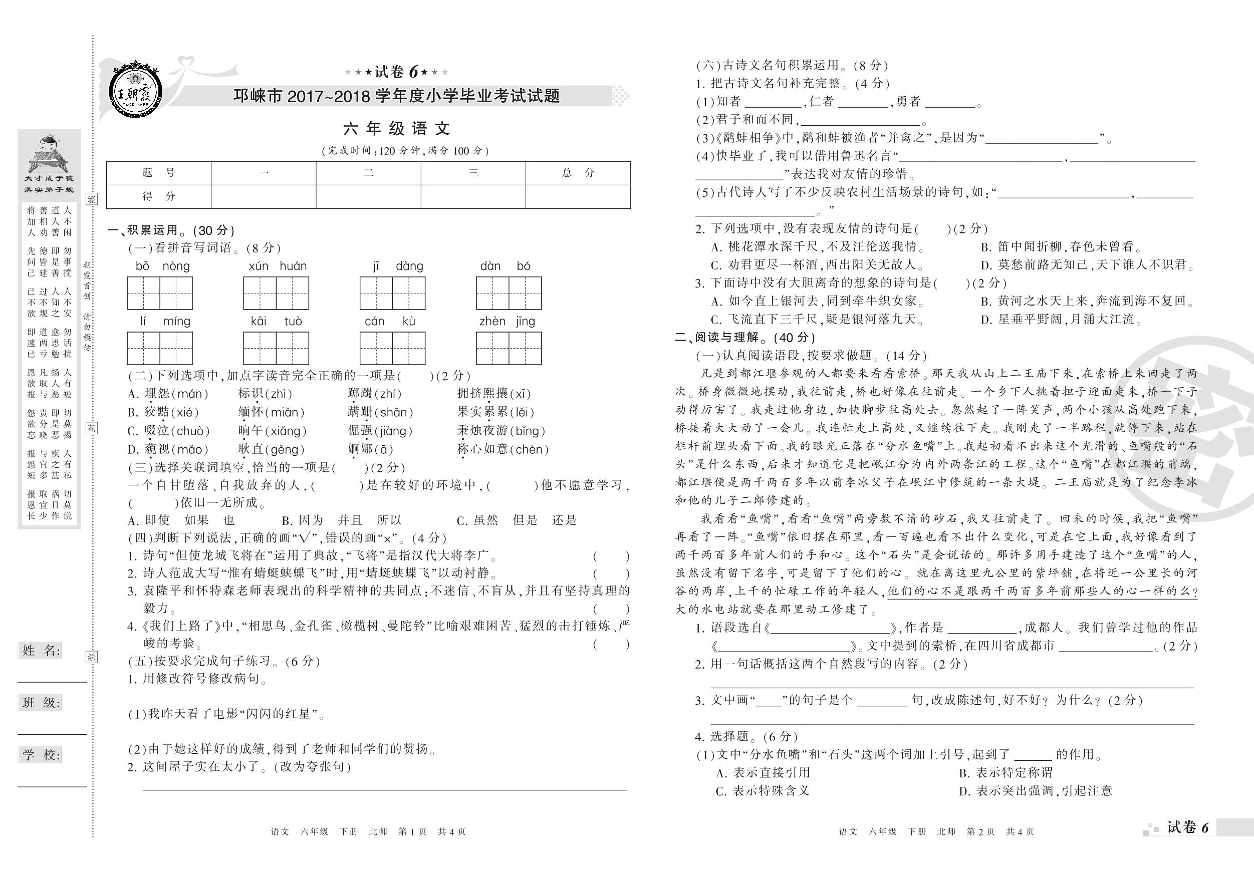 2017-2018学年第二学期成都市邛崃区六年级语文试卷(北师版)【6】