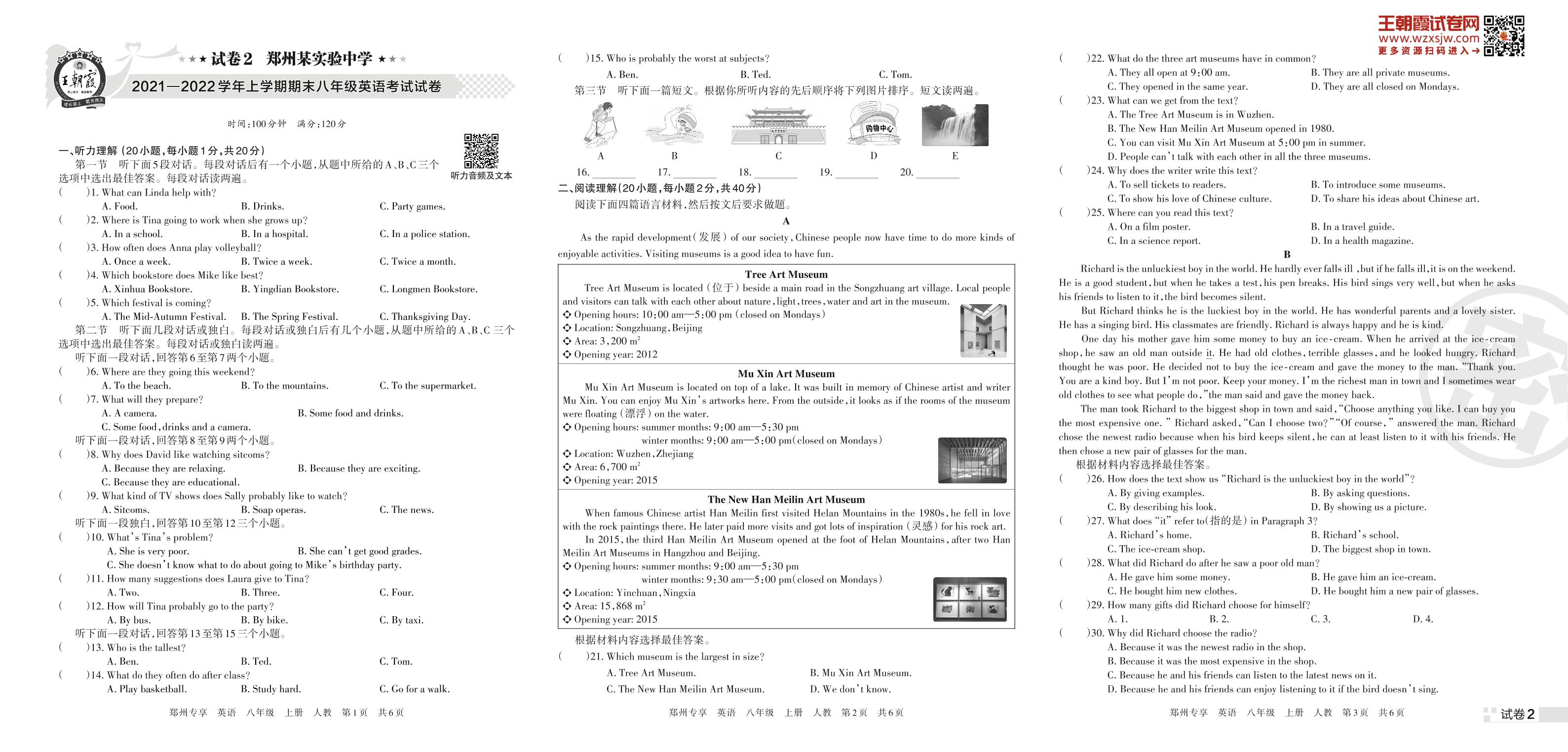 郑州某实验中学2021—2022学年上学期期末八年级英语考试试卷(人教版)【2】