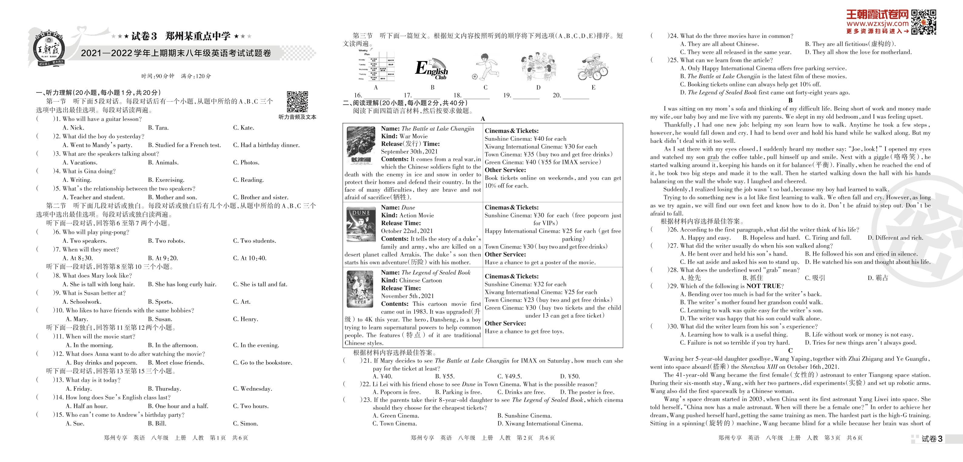 郑州某重点中学2021—2022学年上期期末八年级英语考试试题卷(人教版)【3】