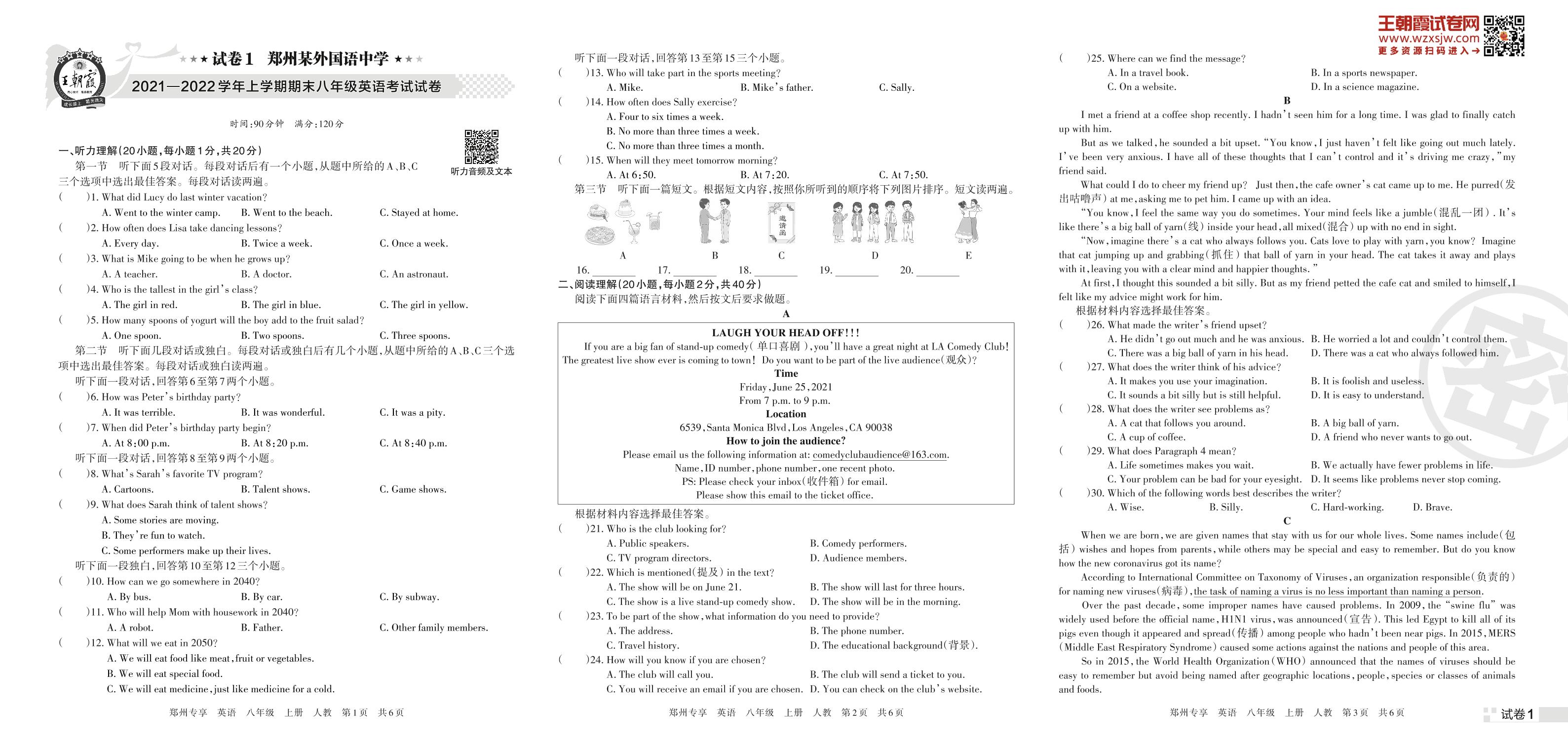 郑州某外国语中学2021—2022学年上学期期末八年级英语考试试卷(人教版)【1】