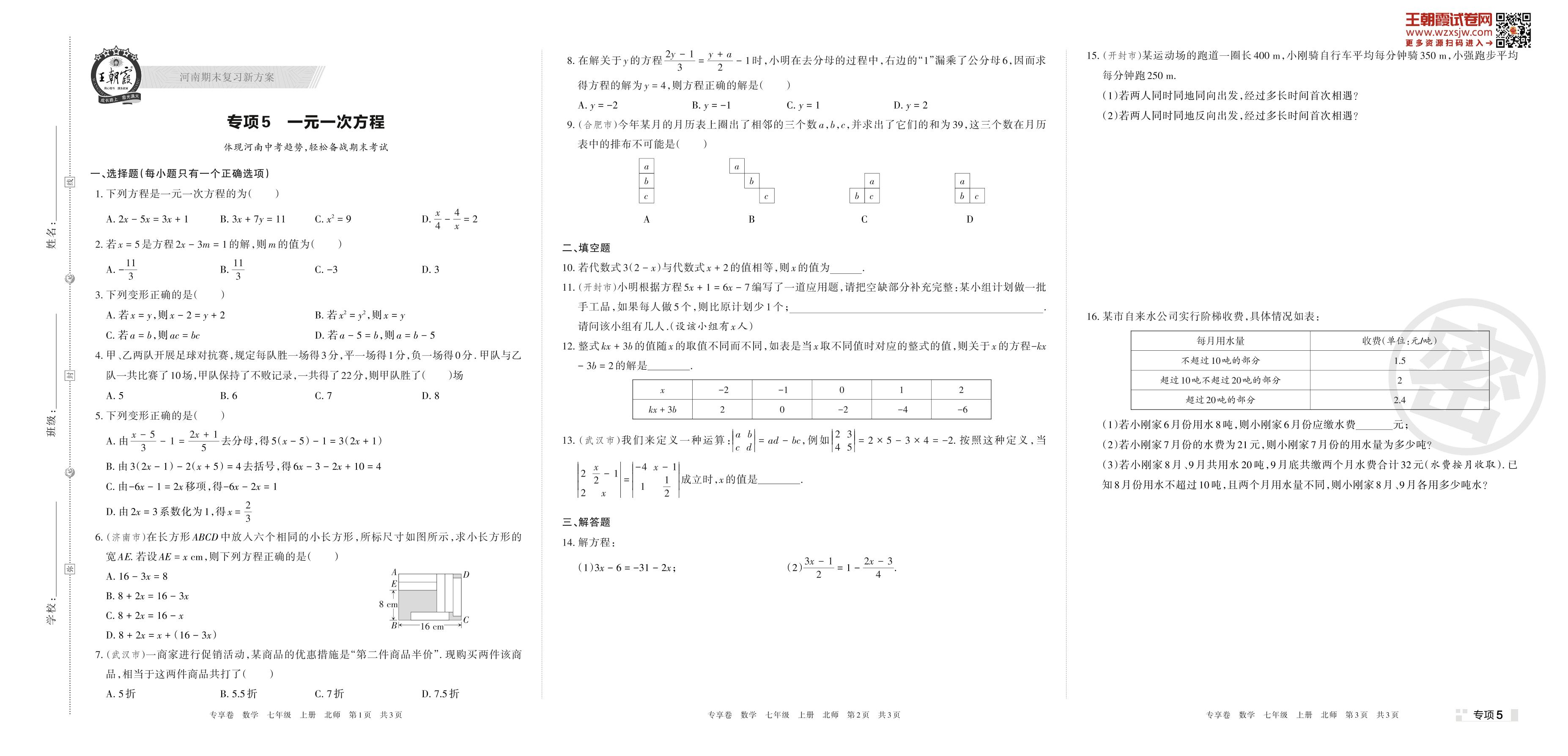 王朝霞期末专项卷——一元一次方程七年级上册数学(北师版)【5】