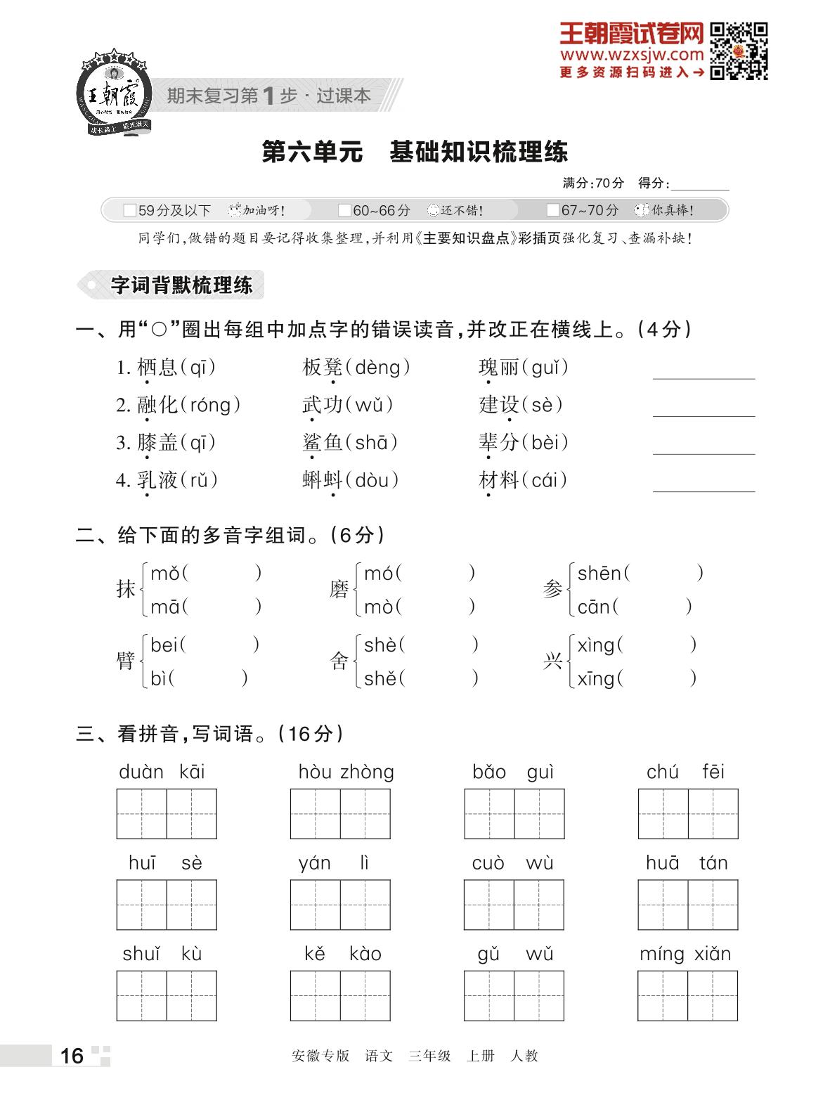 王朝霞期末过课本——第六单元 基础知识梳理练三年级上册语文(人教版)_R221126200236617