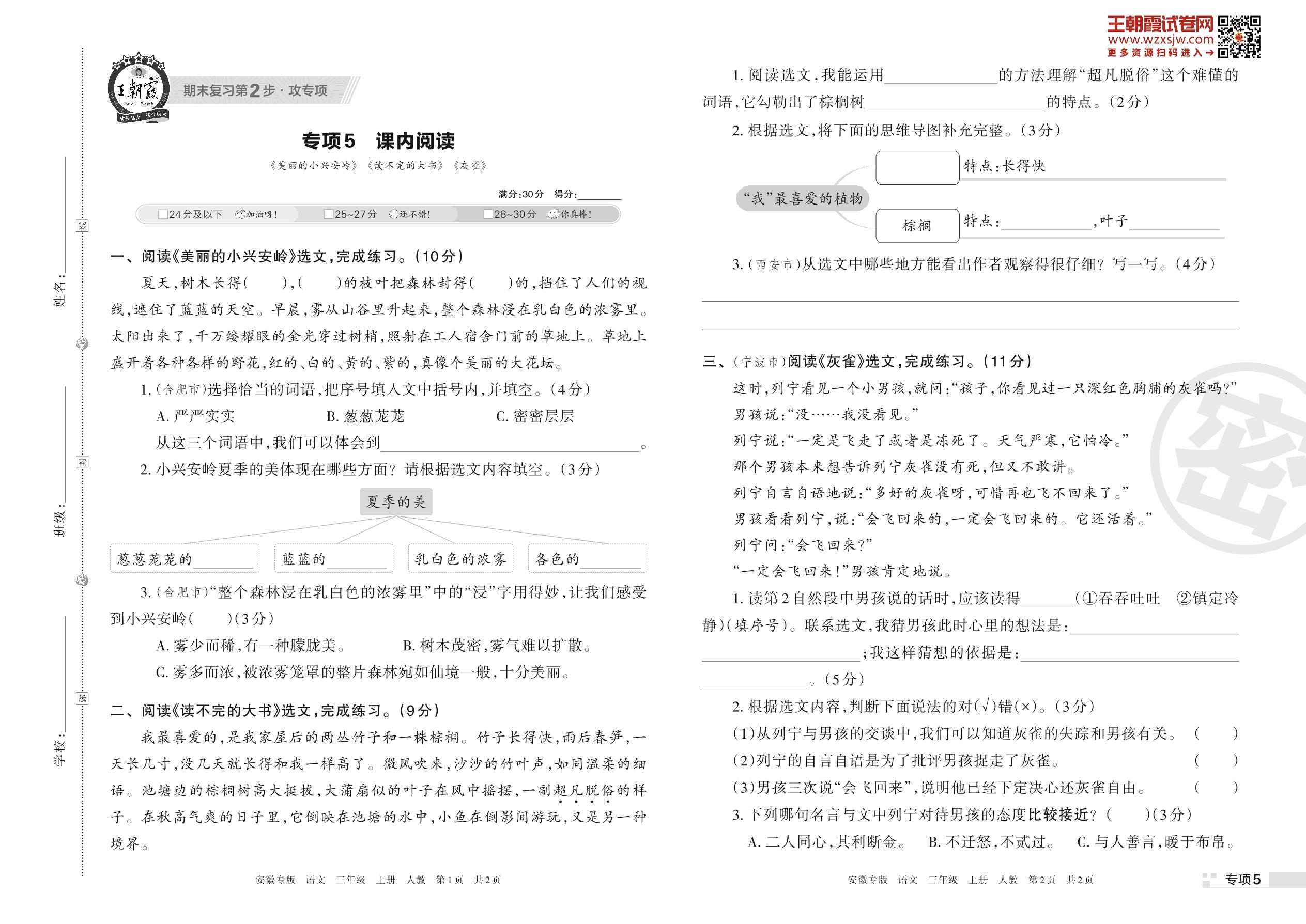 王朝霞期末专项卷——课内阅读三年级上册语文(人教版)【5】