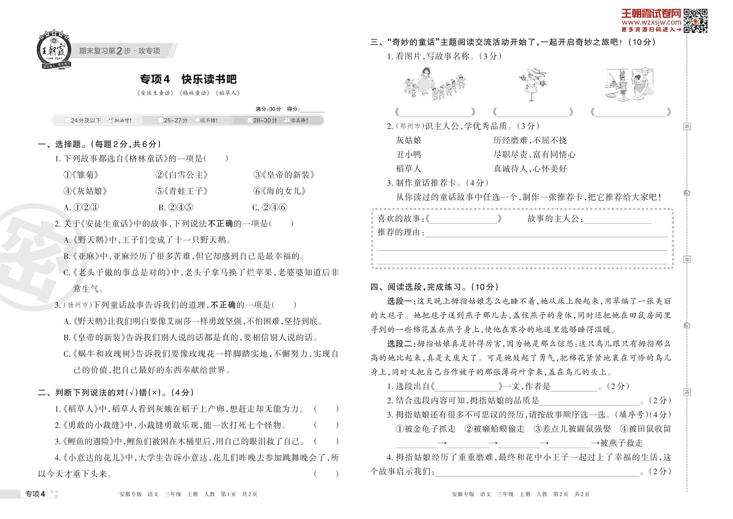 王朝霞期末专项卷——快乐读书吧三年级上册语文(人教版)【4】