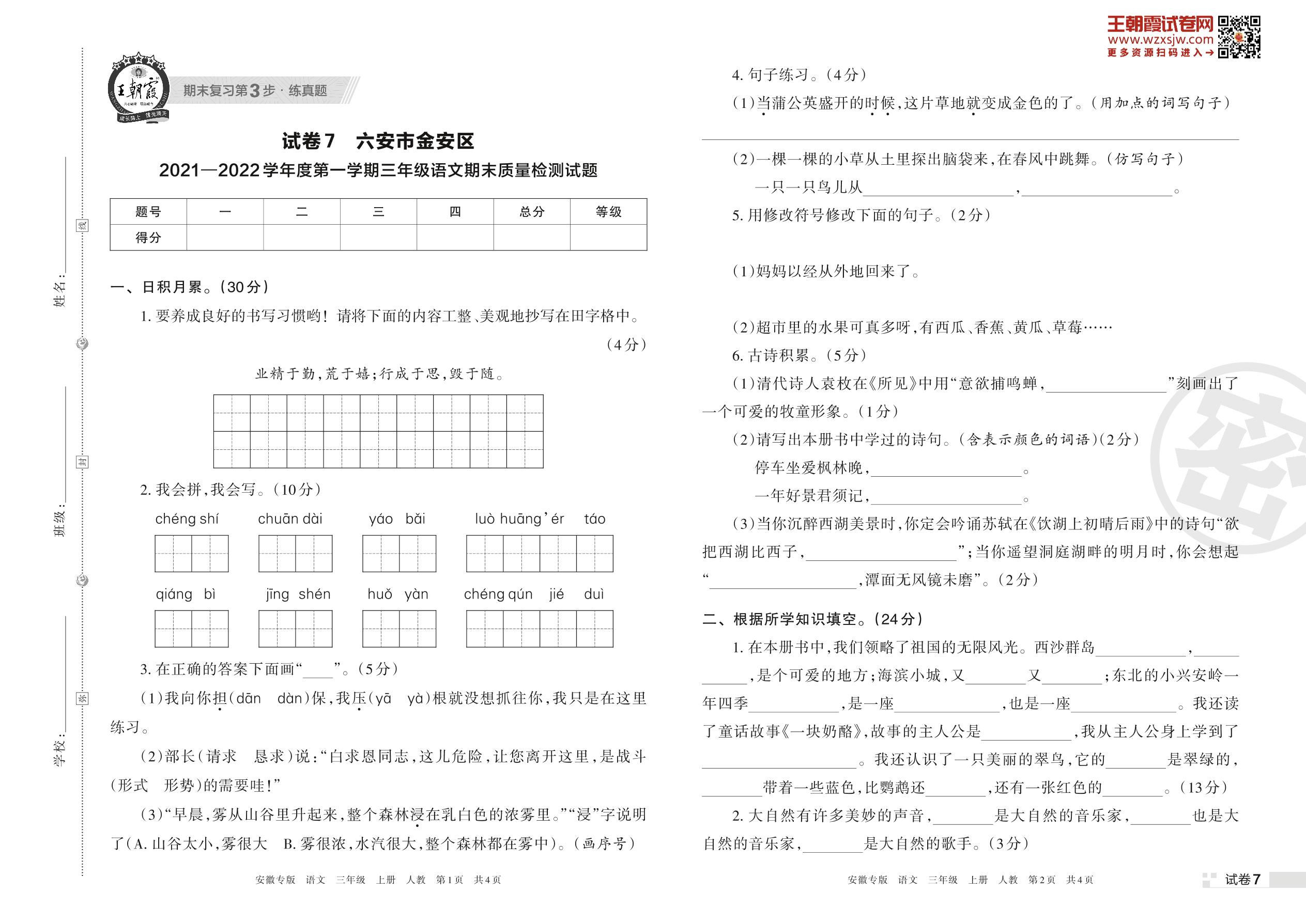 六安市金安区2021—2022学年度第一学期三年级语文期末质量检测试题(人教版)【7】
