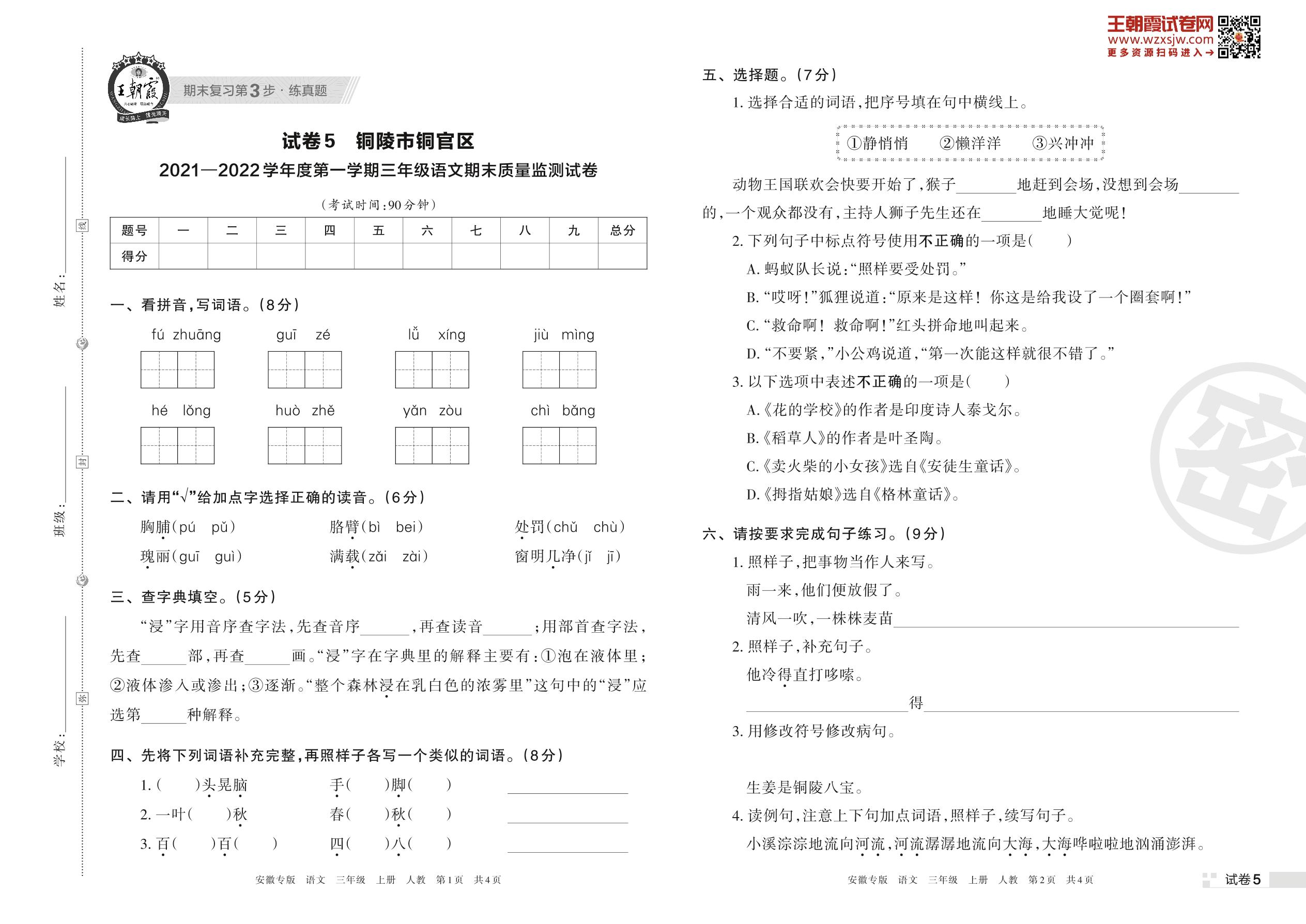 铜陵市铜官区2021—2022学年度第一学期三年级语文期末质量监测试卷(人教版)【5】