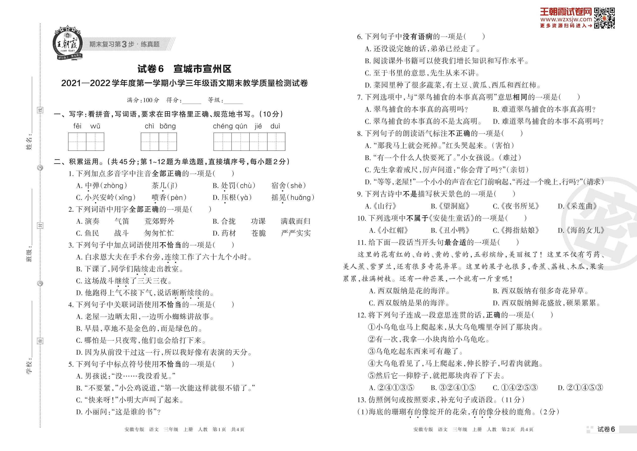 宣城市宣州区2021—2022学年度第一学期小学三年级语文期末教学质量检测试卷(人教版)【6】
