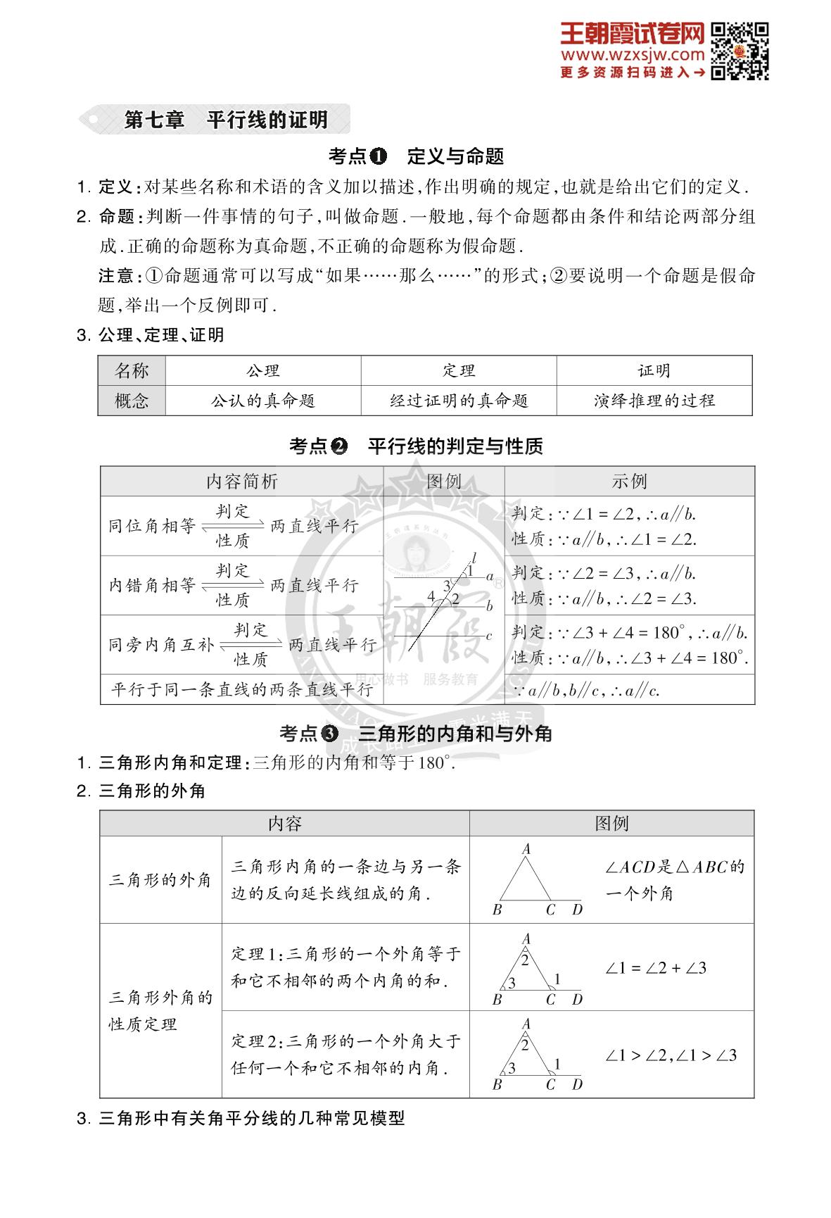 王朝霞期末过课本——第七章 平行线的证明八年级上册数学(北师版)