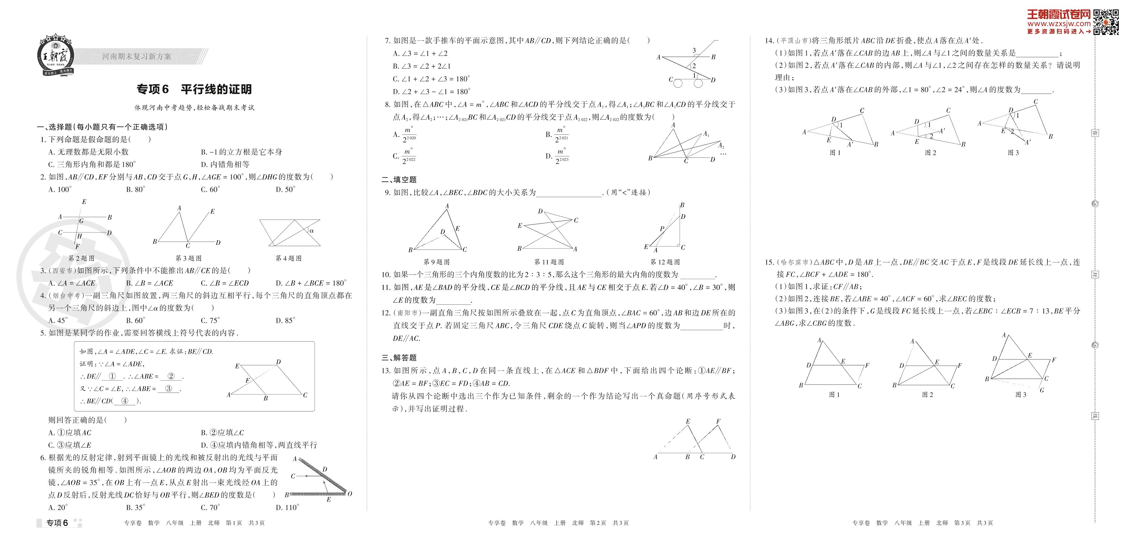 王朝霞期末专项卷——平行线的证明八年级上册数学(北师版)【6】
