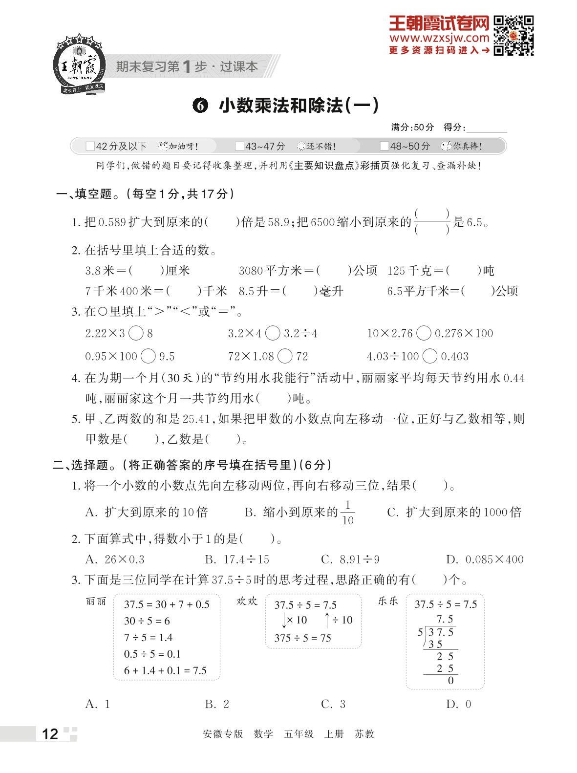 王朝霞期末过课本——6 小数乘法和除法(一)五年级上册数学(苏教版)_R221126201545560