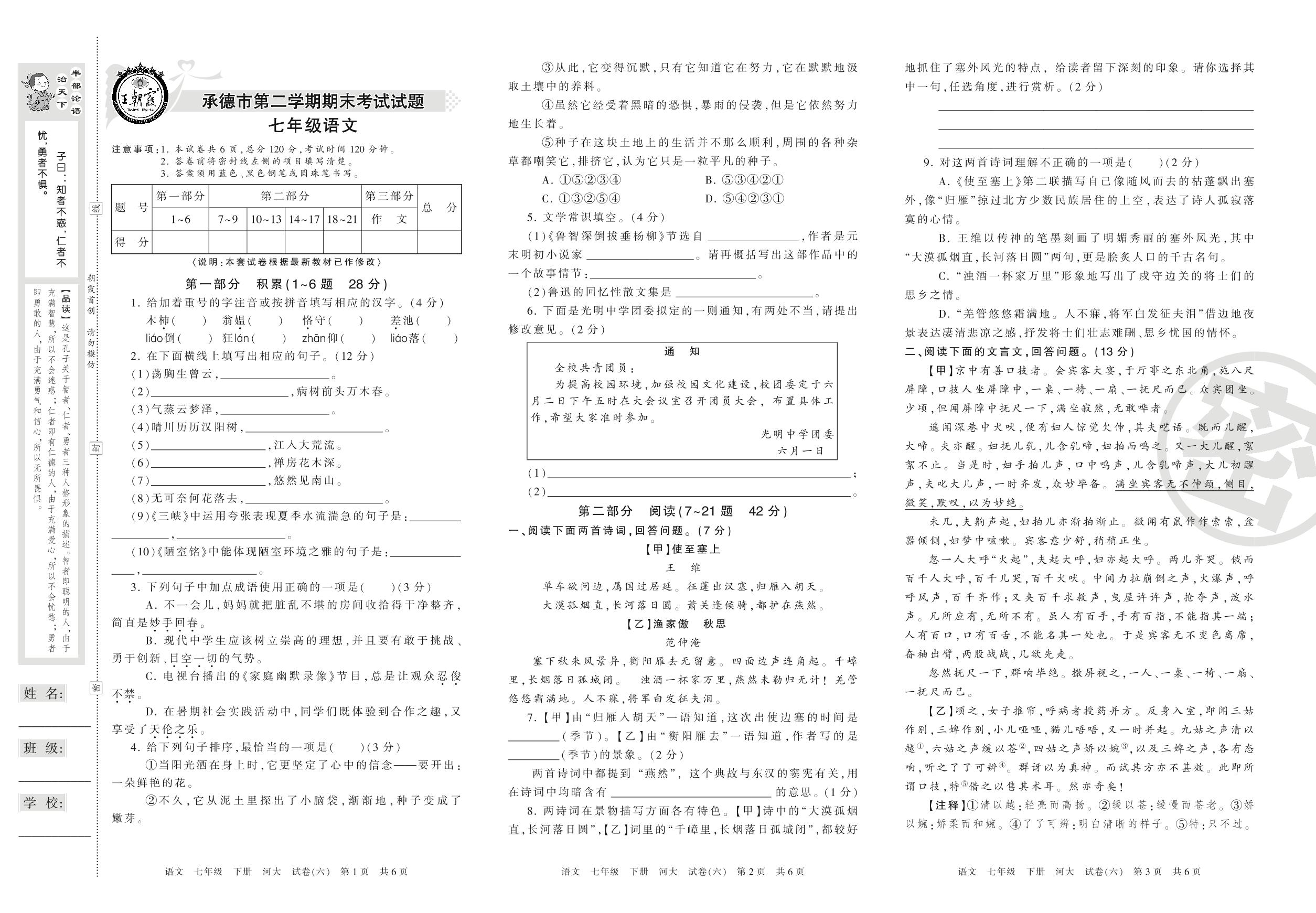 2015-2016学年第二学期承德市七年级语文试卷(河大版)【6】