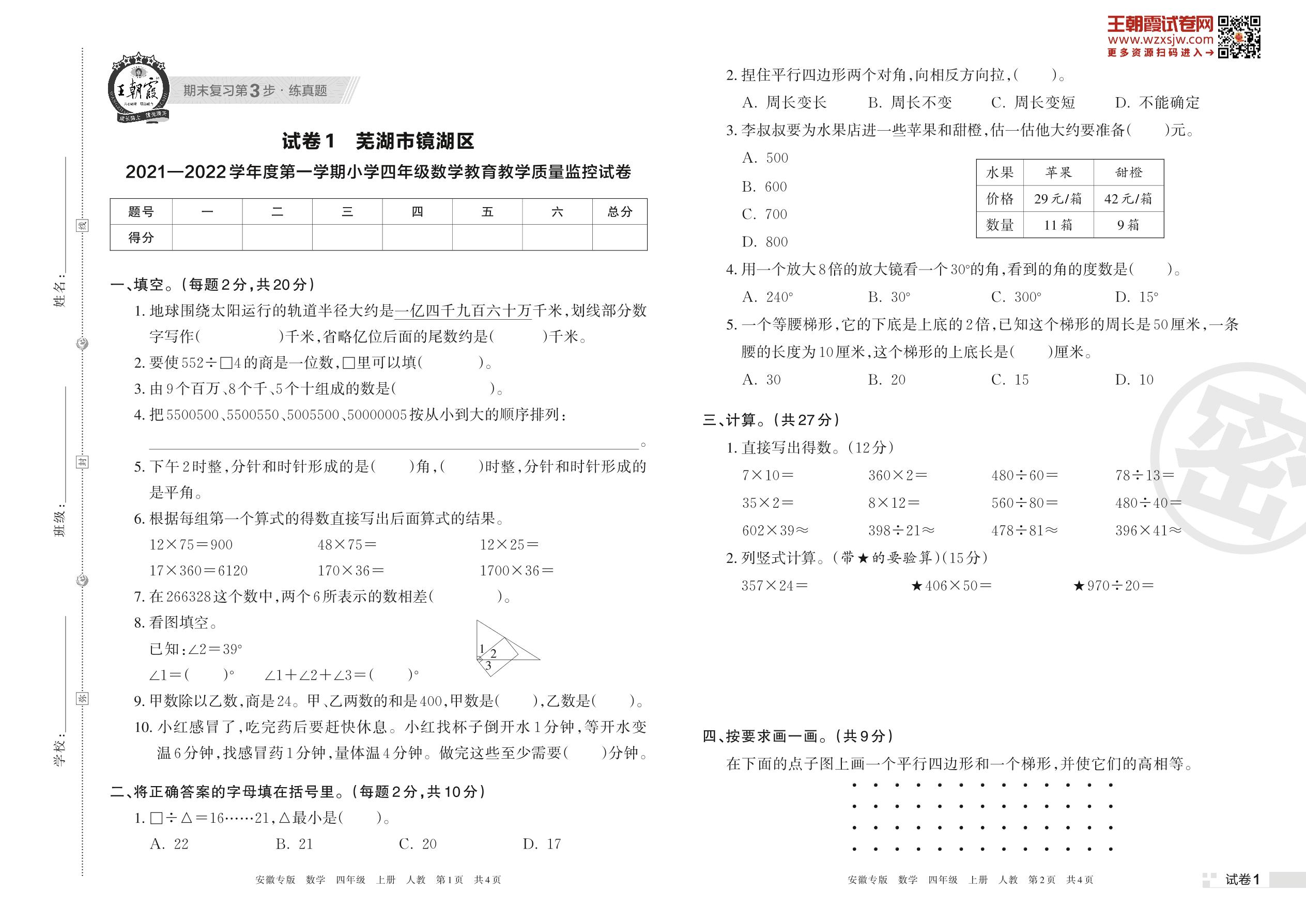 芜湖市镜湖区2021—2022学年度第一学期小学四年级数学教育教学质量监控试卷(人教版)【1】