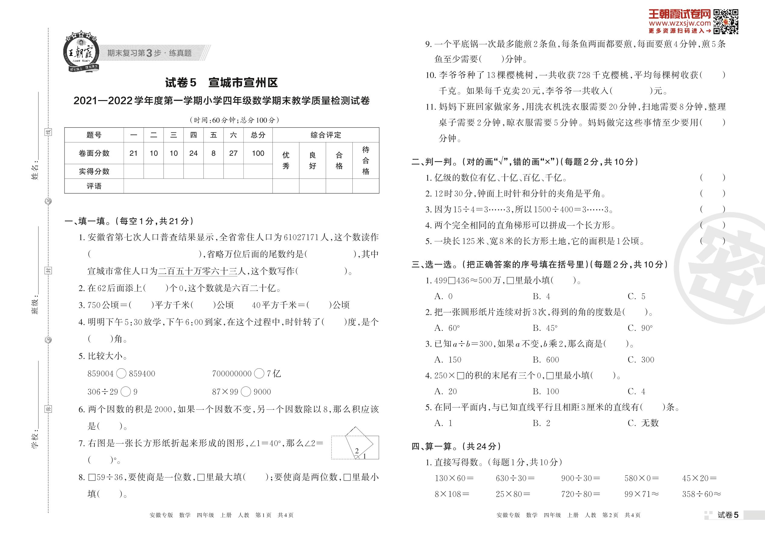 宣城市宣州区2021—2022学年度第一学期小学四年级数学期末教学质量检测试卷(人教版)【5】