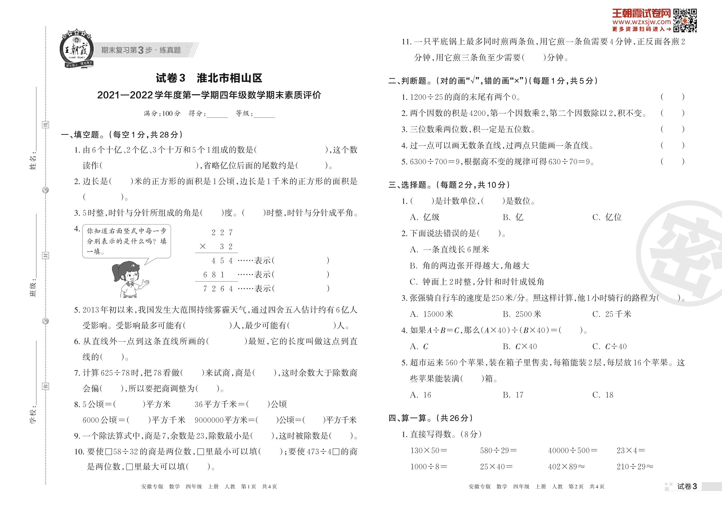 淮北市相山区2021—2022学年度第一学期四年级数学期末素质评价(人教版)【3】