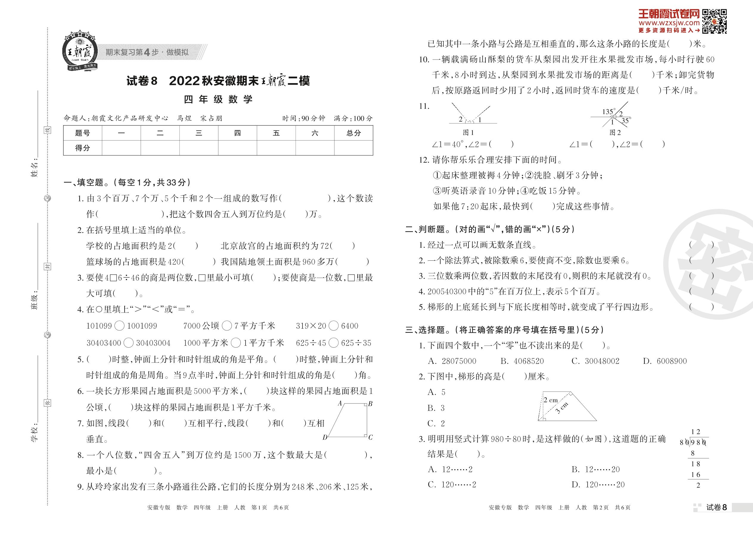 王朝霞期末模拟卷四年级上册数学(人教版)_R221126202507528【8】