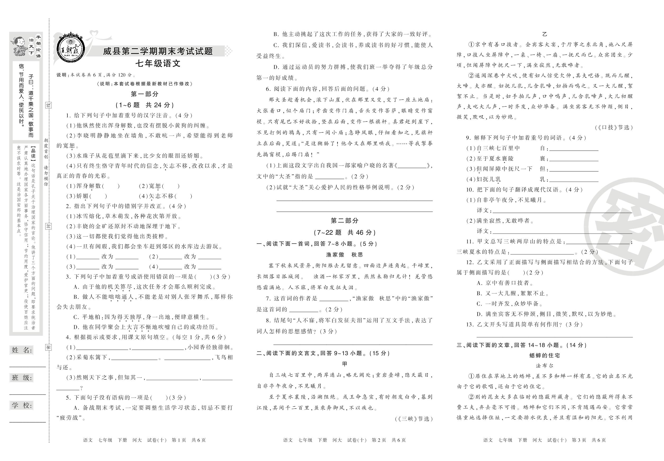 2015-2016学年第二学期邢台市威县七年级语文试卷(河大版)【10】