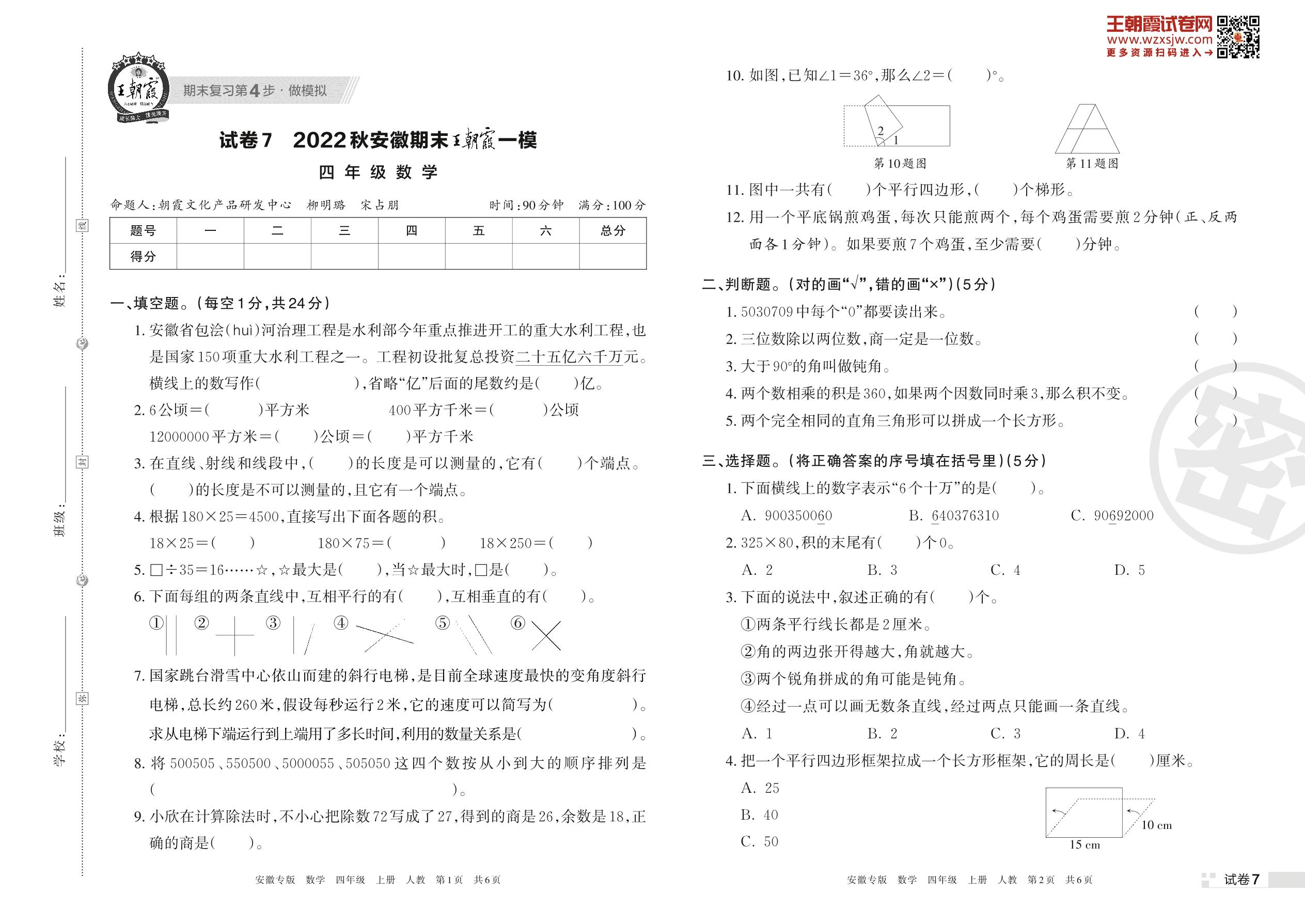 王朝霞期末模拟卷四年级上册数学(人教版)_R221126202508485【7】