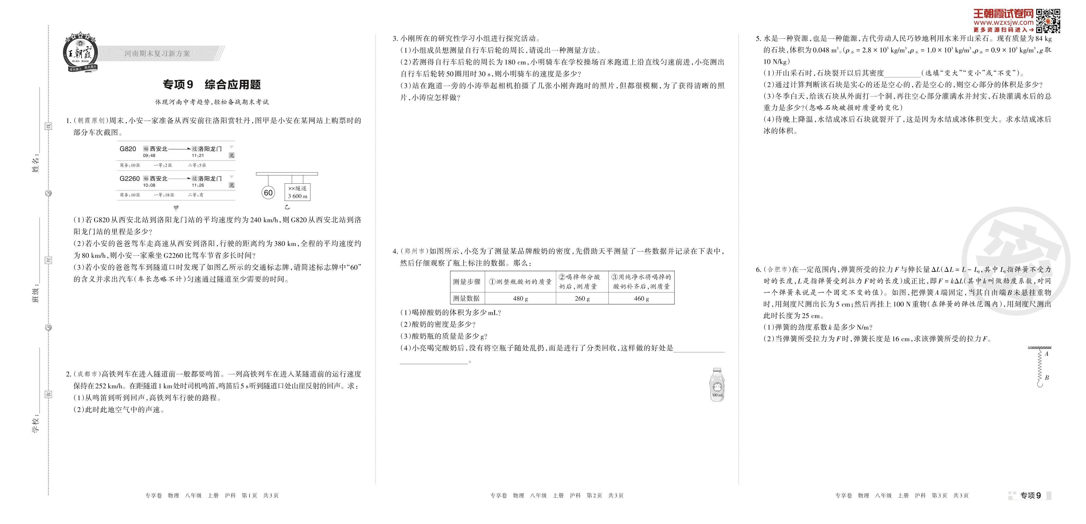王朝霞期末专项卷——综合应用题八年级上册物理(沪科版)【9】