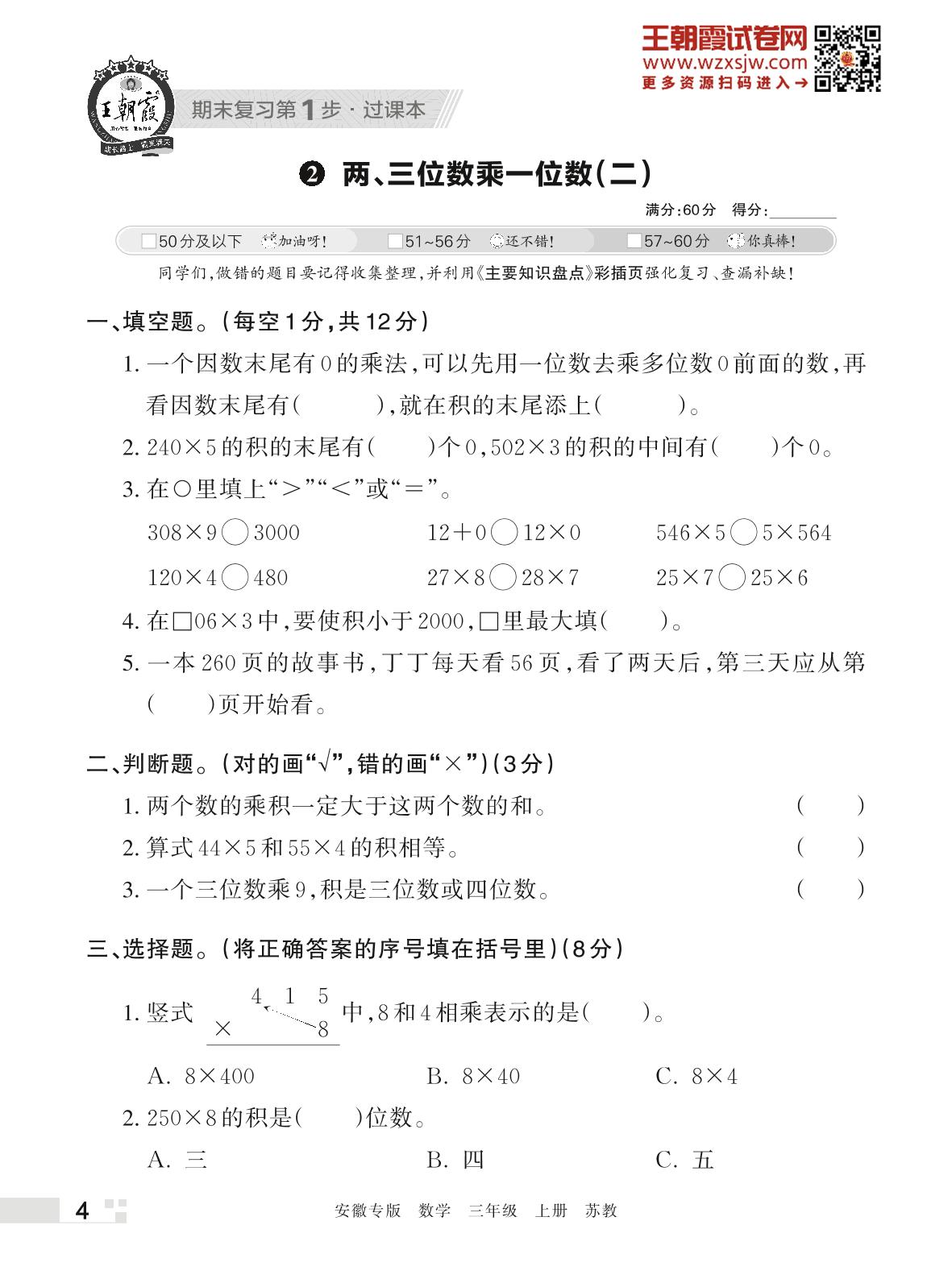 王朝霞期末过课本——2 两、三位数乘一位数(二)三年级上册数学(苏教版)_R221126205904989